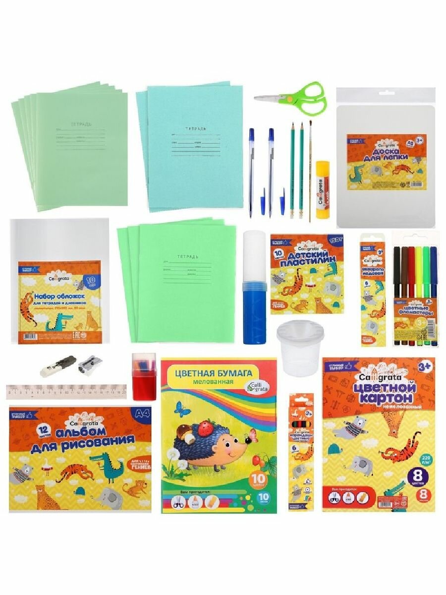 | В комплекте | Тетрадь в клетку - 5 шт; Тетрадь в косую линию - 3 шт; Тетрадь в линейку - 2 шт; Ручка шариковая (синяя) - 2 шт; Пластилин - 1 набор; Бумага цветная - 1 набор; Картон цветной - 1 набор; Карандаши цветные - 1 набор; Доска для лепки - 1 шт; Карандаш чернографитный - 2 шт; Альбом для рисования - 1шт; Ластик - 1 шт; Точилка - 1 шт; Ножницы - 1 шт; Краски акварельные - 1 шт; Кисть - 1 шт; Клей-карандаш -1 шт; Линейка - 1 шт; Фломастеры - 1 набор; Обложки для тетрадей - 10 шт; Пенал - 1 шт; Счётные палочки - 1 набор; Коробка подарочная - 1 шт; Стакан-непроливайка - 1 шт. |