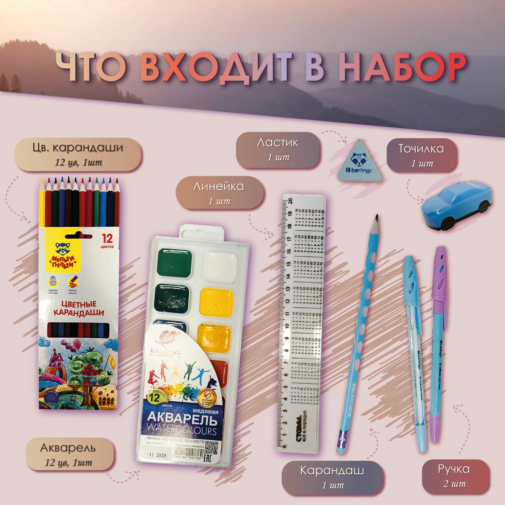 | В комплекте | альбом для рисования А4 16л. - 1шт; картон белый 8л. - 1шт; карандаши цветные 12цв. - 1шт; карандаш чернографитный - 1шт; краски акварельные 12цв. - 1шт; ластик - 1шт; линейка 20см - 1шт; обложки для тетрадей прозрачные - 10шт; папка с ручками - 1шт; пластилин 10цв. - 1шт; ручка шариковая синяя - 2шт; тетрадь 12л. в клетку - 2шт; точилка - 1шт; цветная бумага 8л. 8цв. - 1шт; картон цветной 8л. 8цв. -1шт |