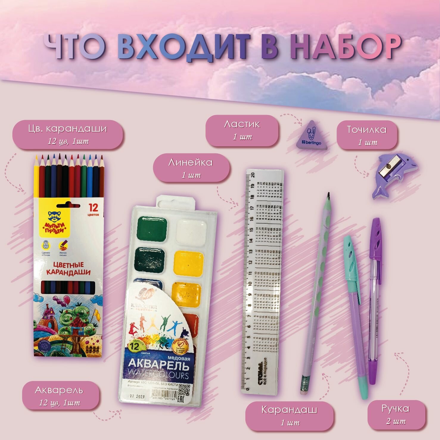 | В комплекте | альбом для рисования А4 16л. - 1шт; картон белый 8л. - 1шт; карандаши цветные 12цв. - 1шт; карандаш чернографитный - 1шт; краски акварельные 12цв. - 1шт; ластик - 1шт; линейка 20см - 1шт; обложки для тетрадей прозрачные - 10шт; папка с ручками - 1шт; пластилин 10цв. - 1шт; ручка шариковая синяя - 2шт; тетрадь 12л. в клетку - 2шт; точилка - 1шт; цветная бумага 8л. 8цв. - 1шт; картон цветной 8л. 8цв. -1шт |