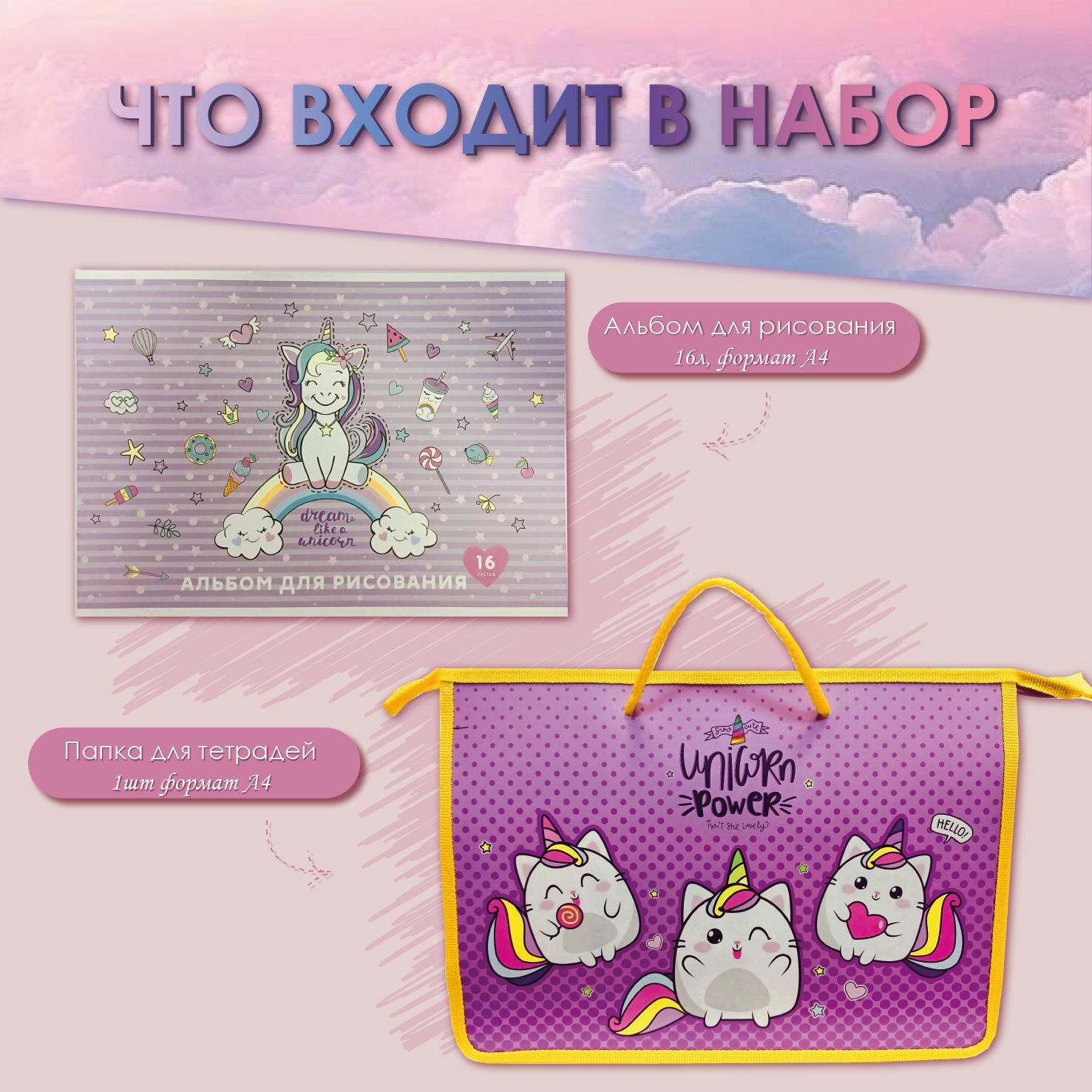 Купить Набор для начальной школы, для девочки 26 предметов "Котоединорожки" в папке, набор школьных канцелярских принадлежностей
