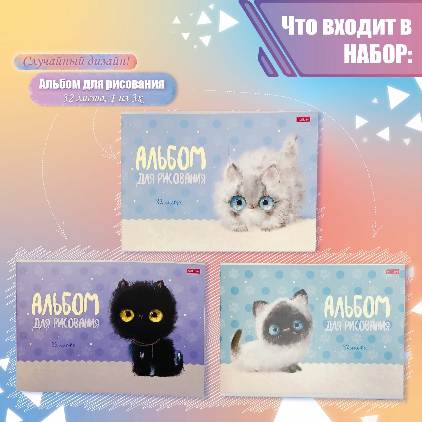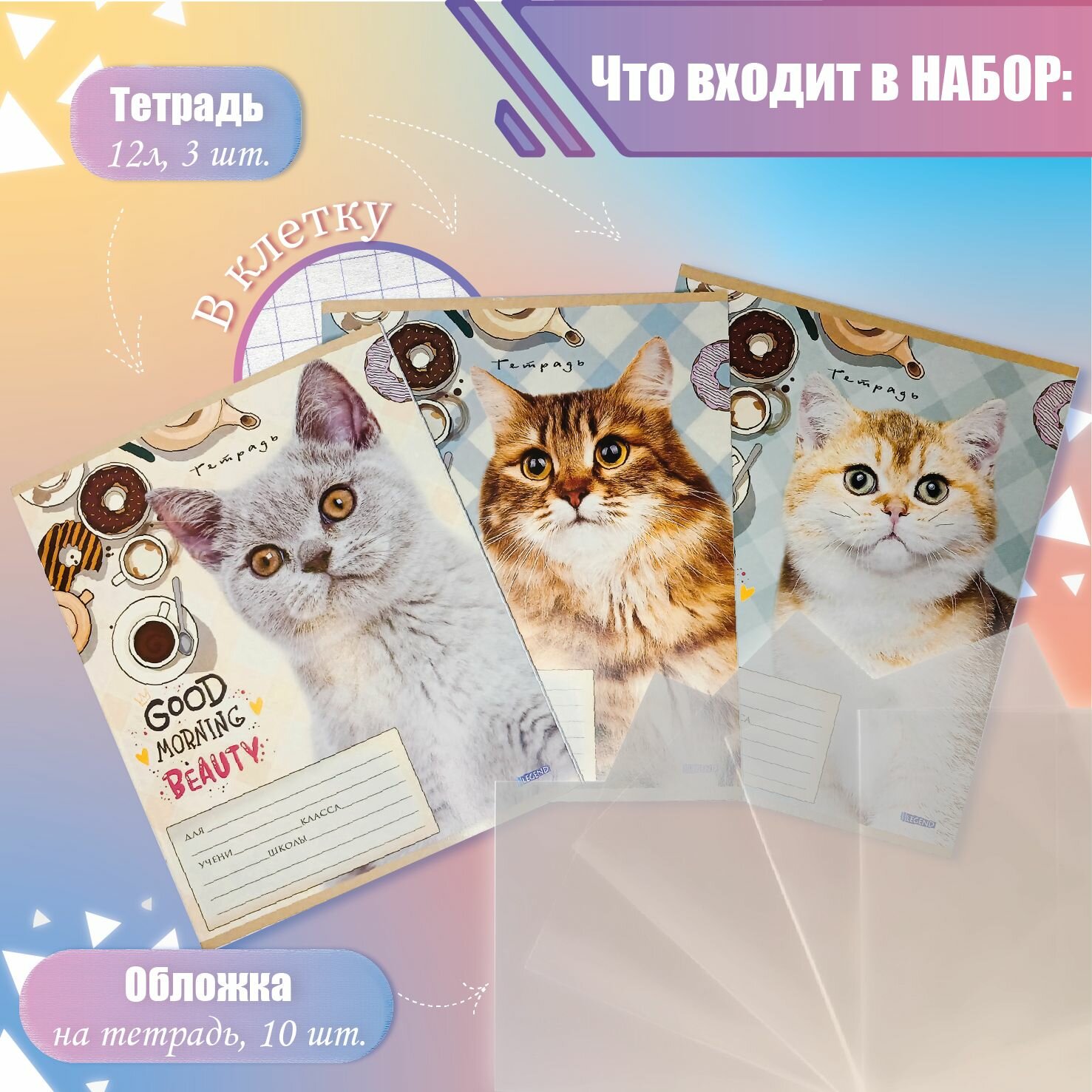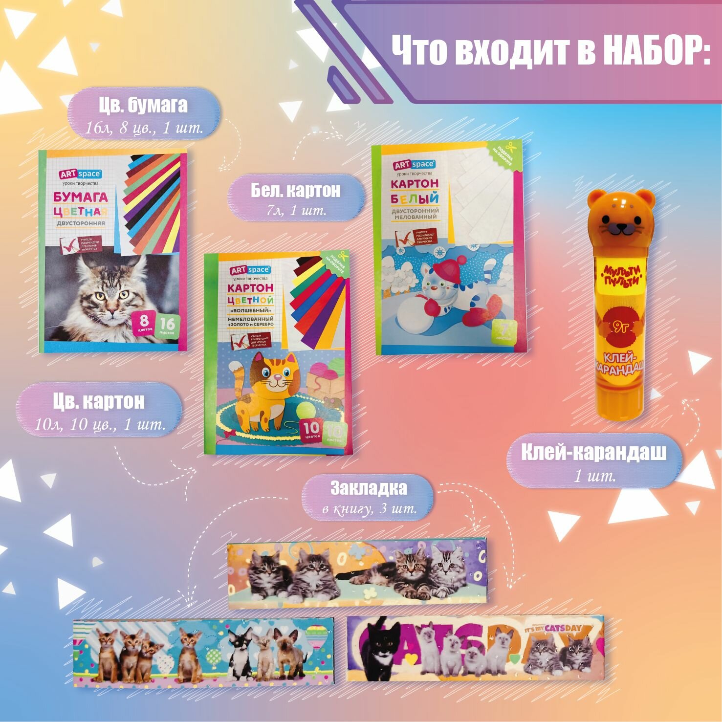 | В наборе | карандаш / клей / линейка / папка пластиковая / ручка / тетрадь / точилка / треугольник |