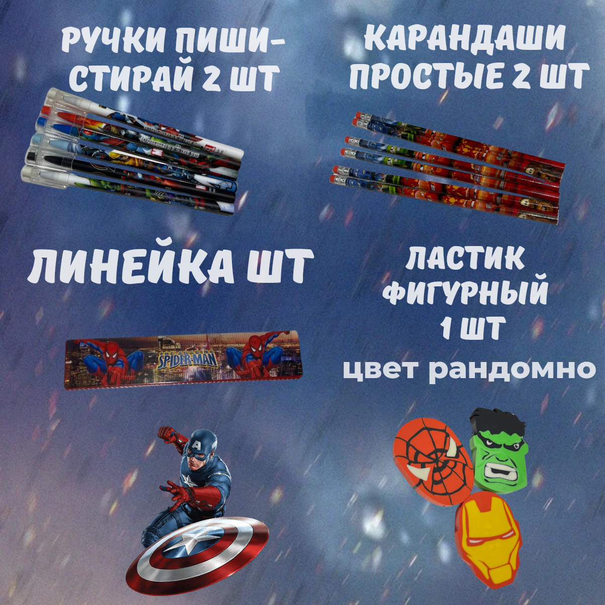 | В комплекте | Набор печать с роликом - 1 шт; Карандаши простые - 2 шт; Ручки шариковые пиши стирай - 2 шт; Ластик фигурный -1 шт; Значок - 1 шт; Линейка -1 шт; Блокнот - 1 шт; Замазка - 1 шт |