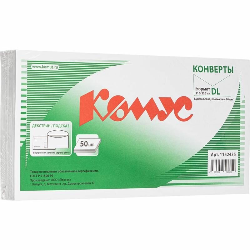 Купить Конверты бумажные почтовые Комус, E65, 110x220 мм, декстрин, 50 штук