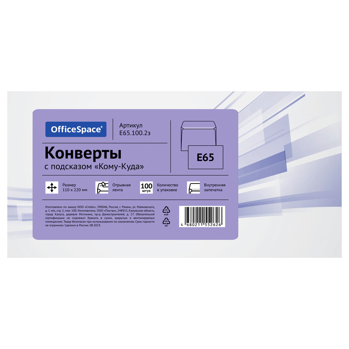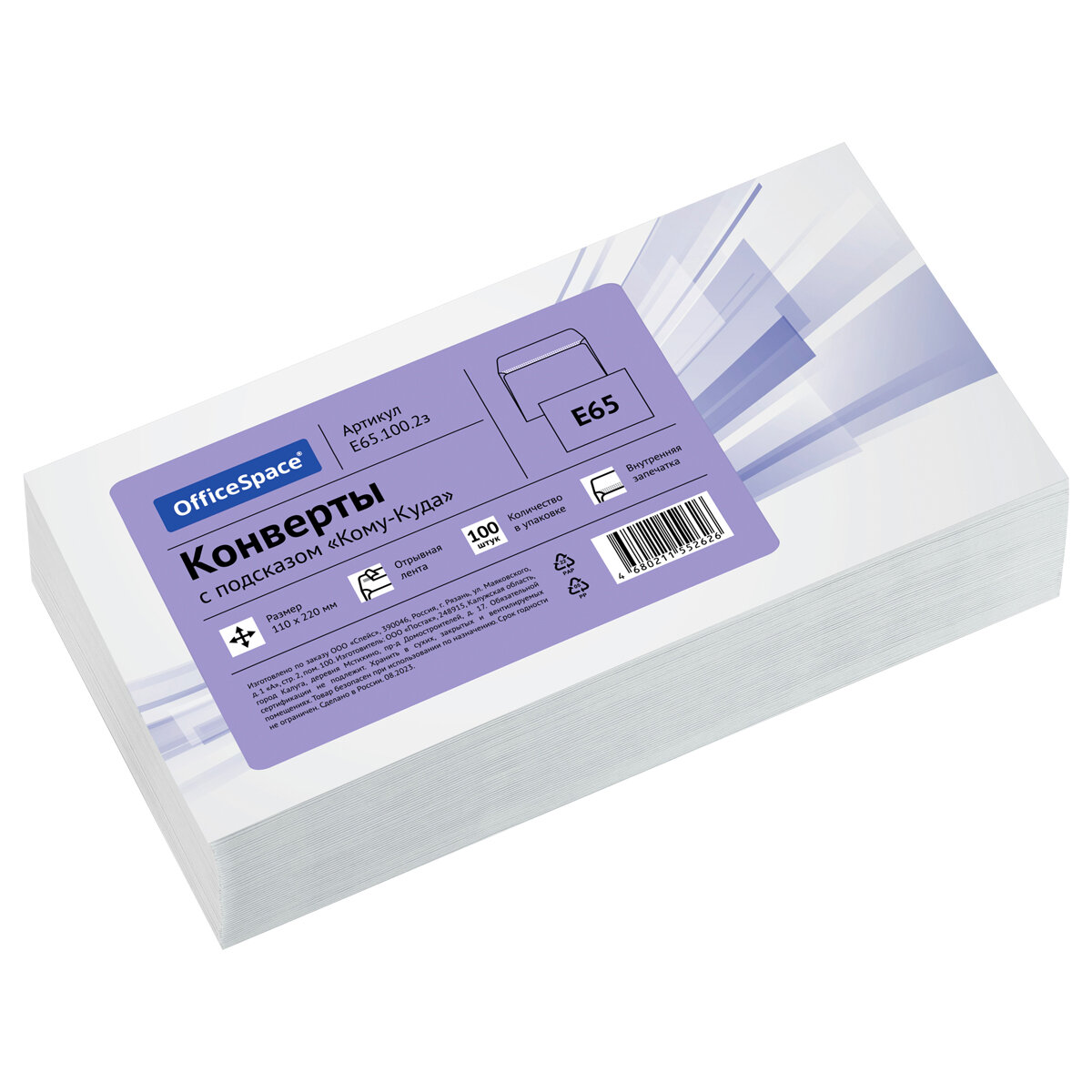 Купить Конверт E65, OfficeSpace, 110*220мм, с подсказом, б/окна, отр. лента, внутренняя запечатка, термоусадка, 100 штук