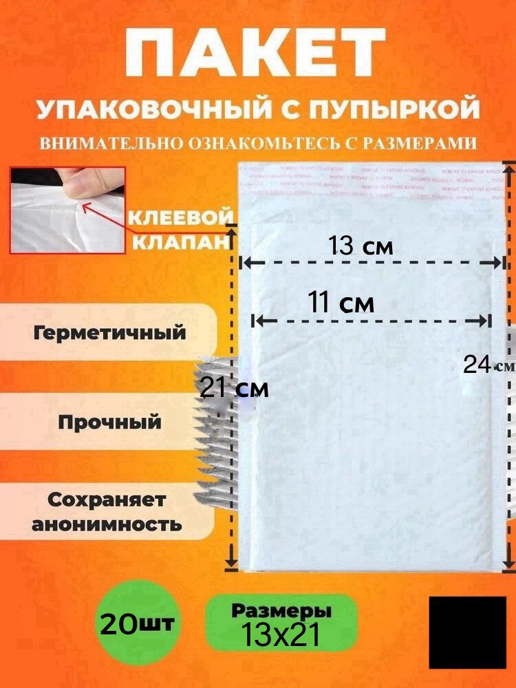 Упаковочный пакет из воздушно-пузырчатой плёнки 13*21 см. Курьерский пакет с пупыркой, белый, 20шт интересное: