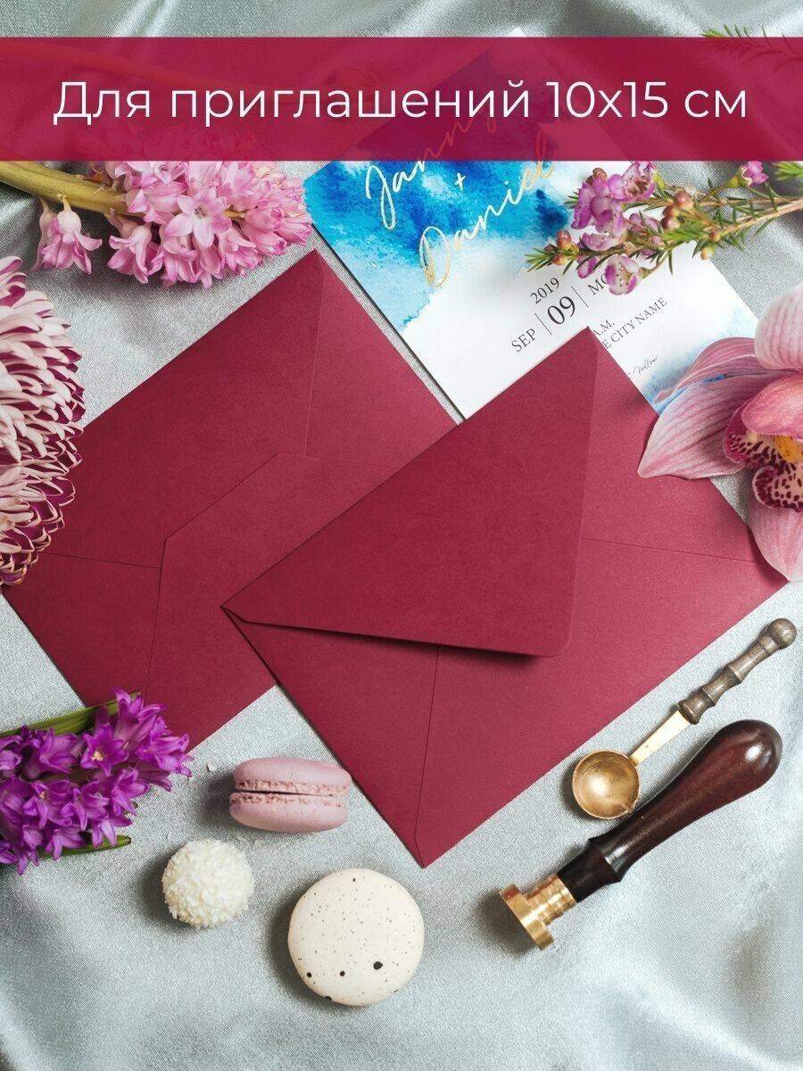 Купить Бордовые конверты бумажные для пригласительных, С6 114х162мм - набор 50 шт. цветные