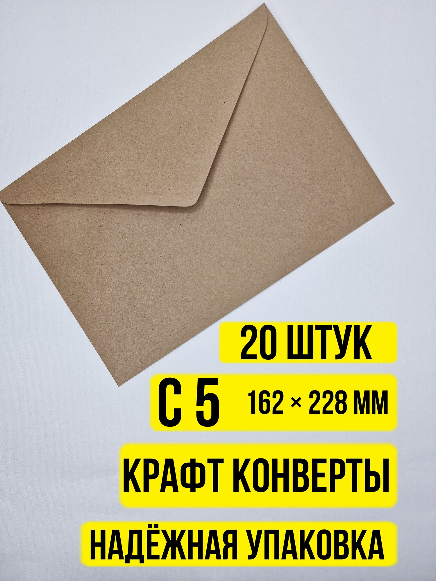 Купить Крафтовые конверты, бумага, С5, 162x228мм, 20 штук, коричневые