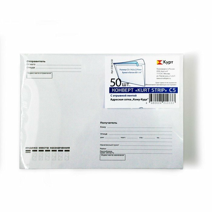 Купить Конверт почтовый С5 KurtStrip (162x229мм, 80г, отрывная лента, печать "Куда-Кому") белый, 50шт. (С50.15.50)