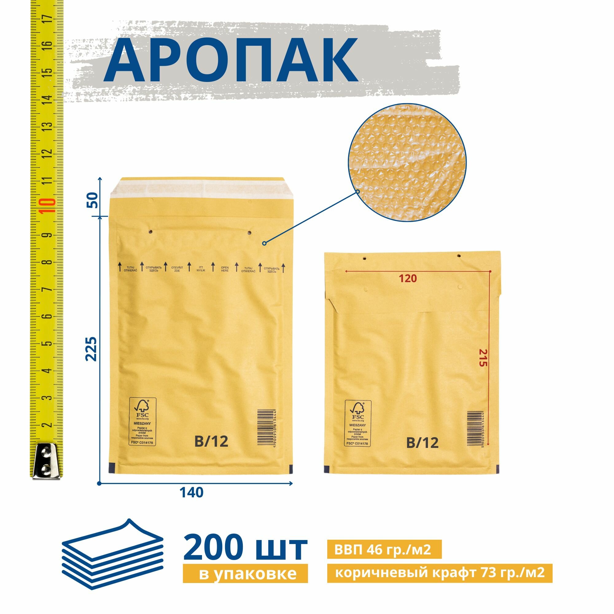 Крафт пакет воздушно пузырчатый премиум 140*215+50 мм, В/12 Белый, 200 штук, AROPAC, конверт почтовый