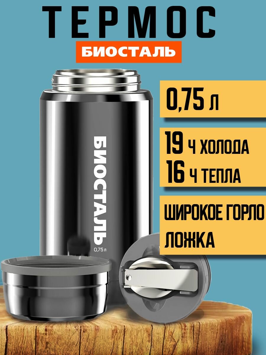 Термос BIOSTAL с широкой горловиной, суповой, цвет "вороненая сталь", 0.75 л. С ложкой NTS-750V
