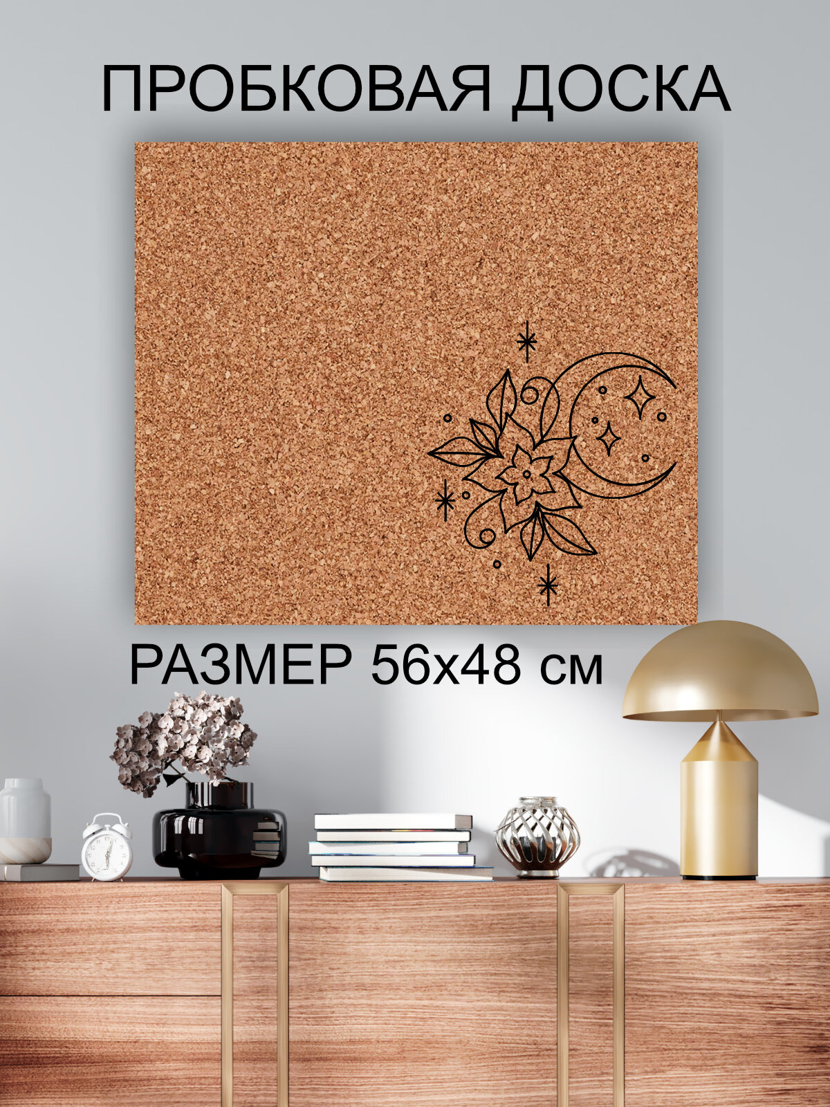 Купить Пробковая доска' Цветок и месяц ' 56х48 см. (Луна, цветы, природа)