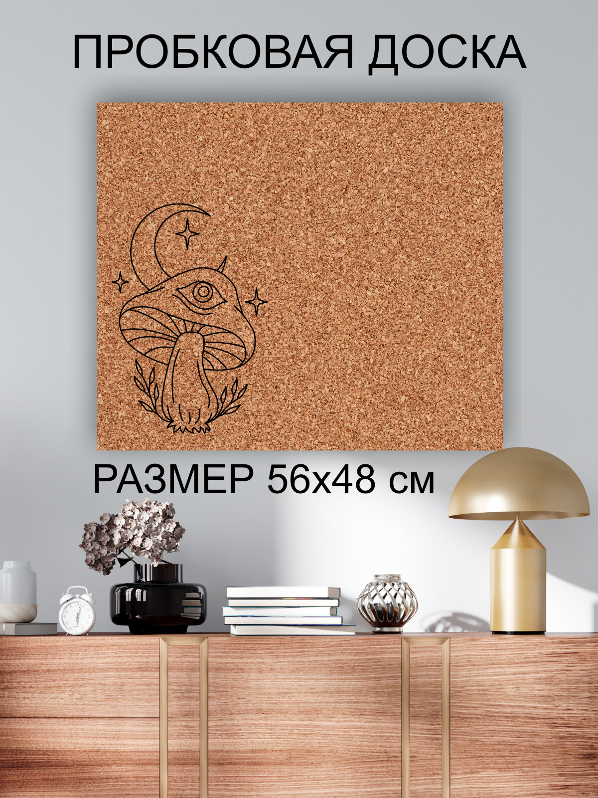 Пробковая доска' Грибочек с глазом ' 56х48 см. (Композиция с грибом, месяцом и звездами) интересное: