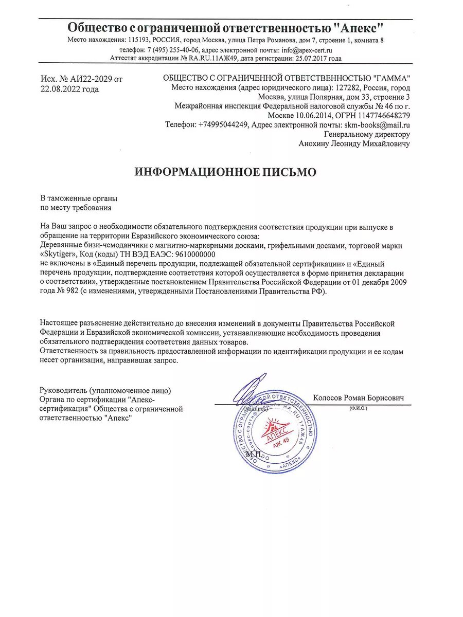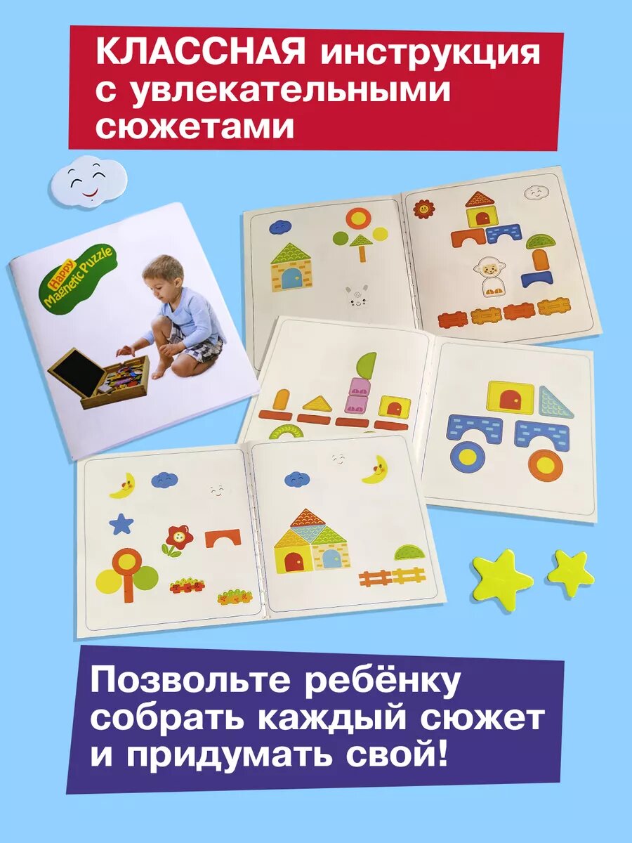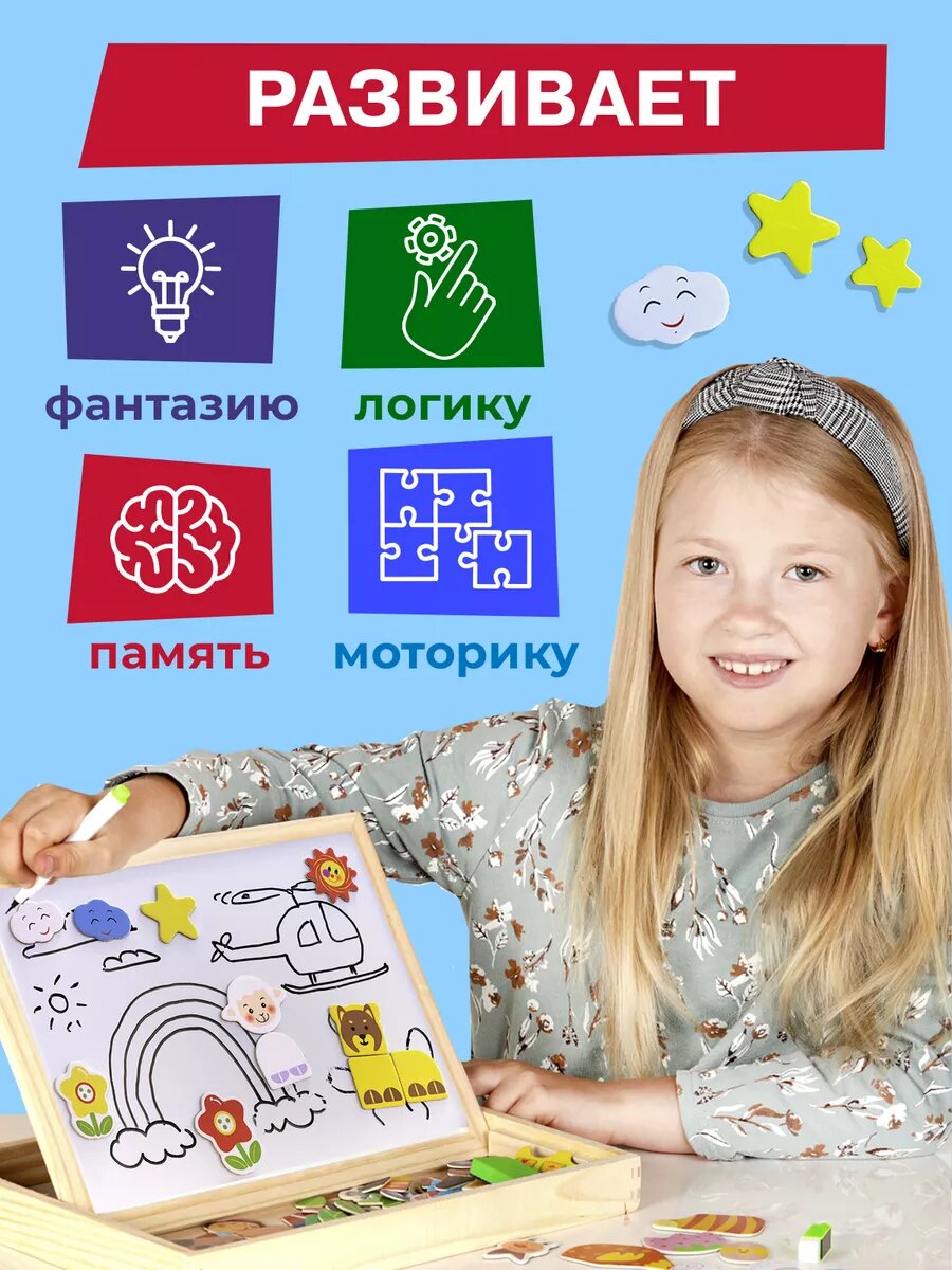 | Подробная комплектация | ящик, двусторонняя доска, набор мелков, маркер, тематические магниты 66 элементов, инструкция |