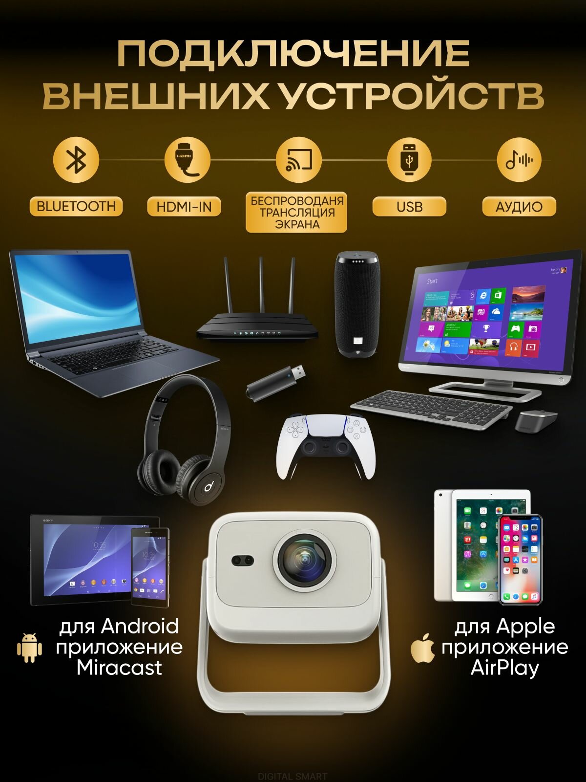 Проектор Умный 5G 2024, FULL HD 4K для фильмов и игр, Встроенные динамики, Wi-Fi, Bluetooth