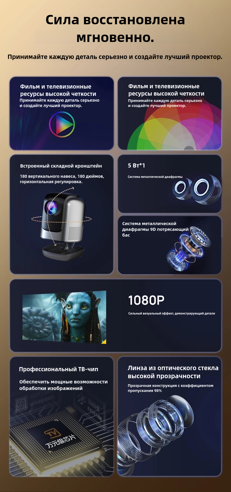Проектор домашний , портативный, мультимедийный, FEEL WOWTZ-1,Full HD 1080P , WIFI, домашний кинотеатр grey интересное: