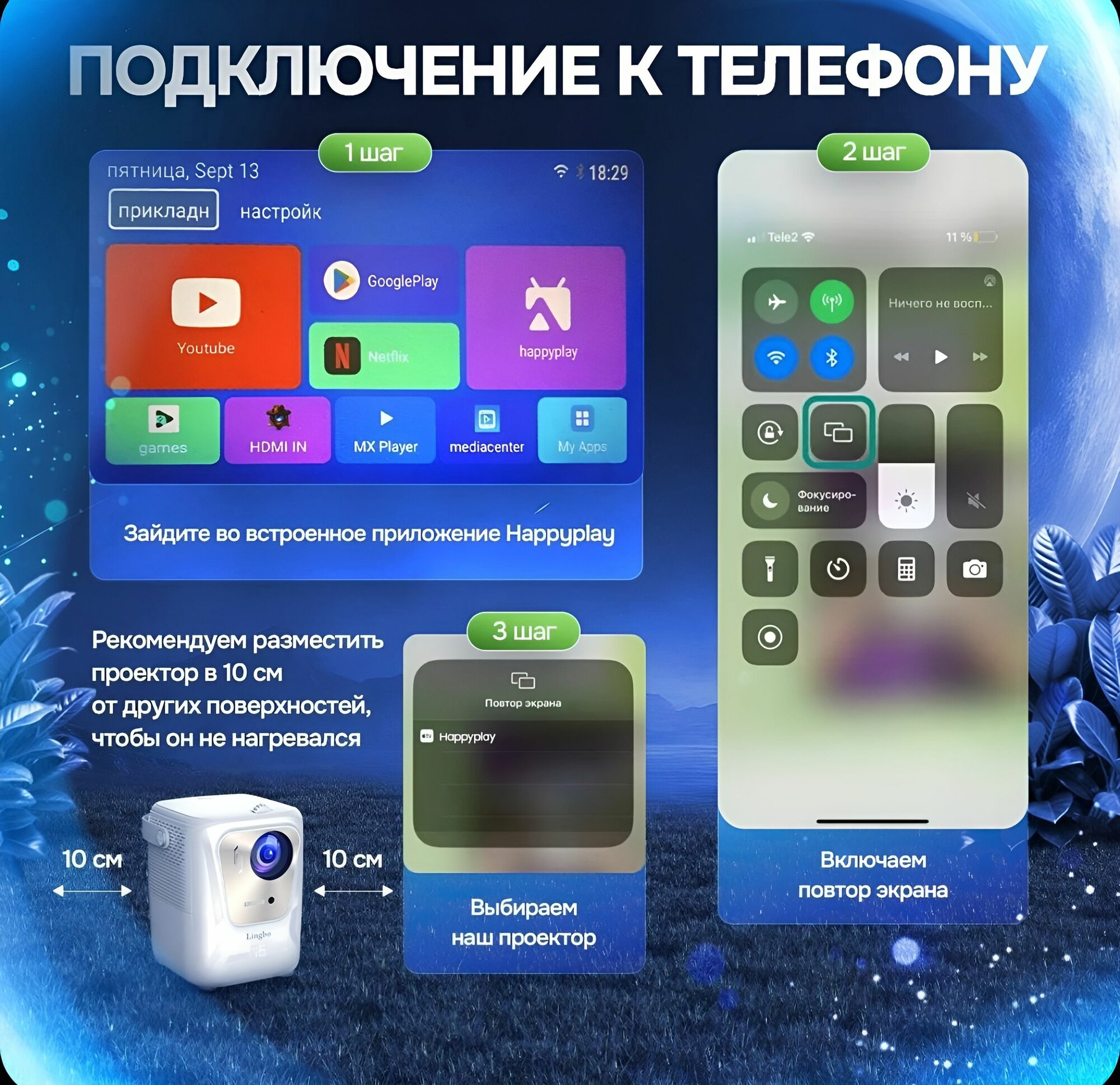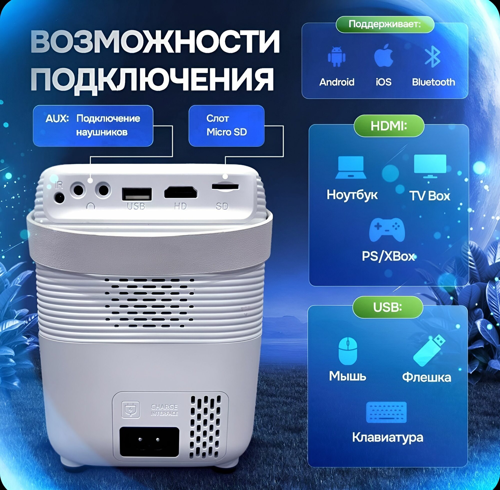 Проектор для фильмов PLAY 03 качество 4K, Wi-Fi + Bluetooth + HDMI, пульт, белый интересное: