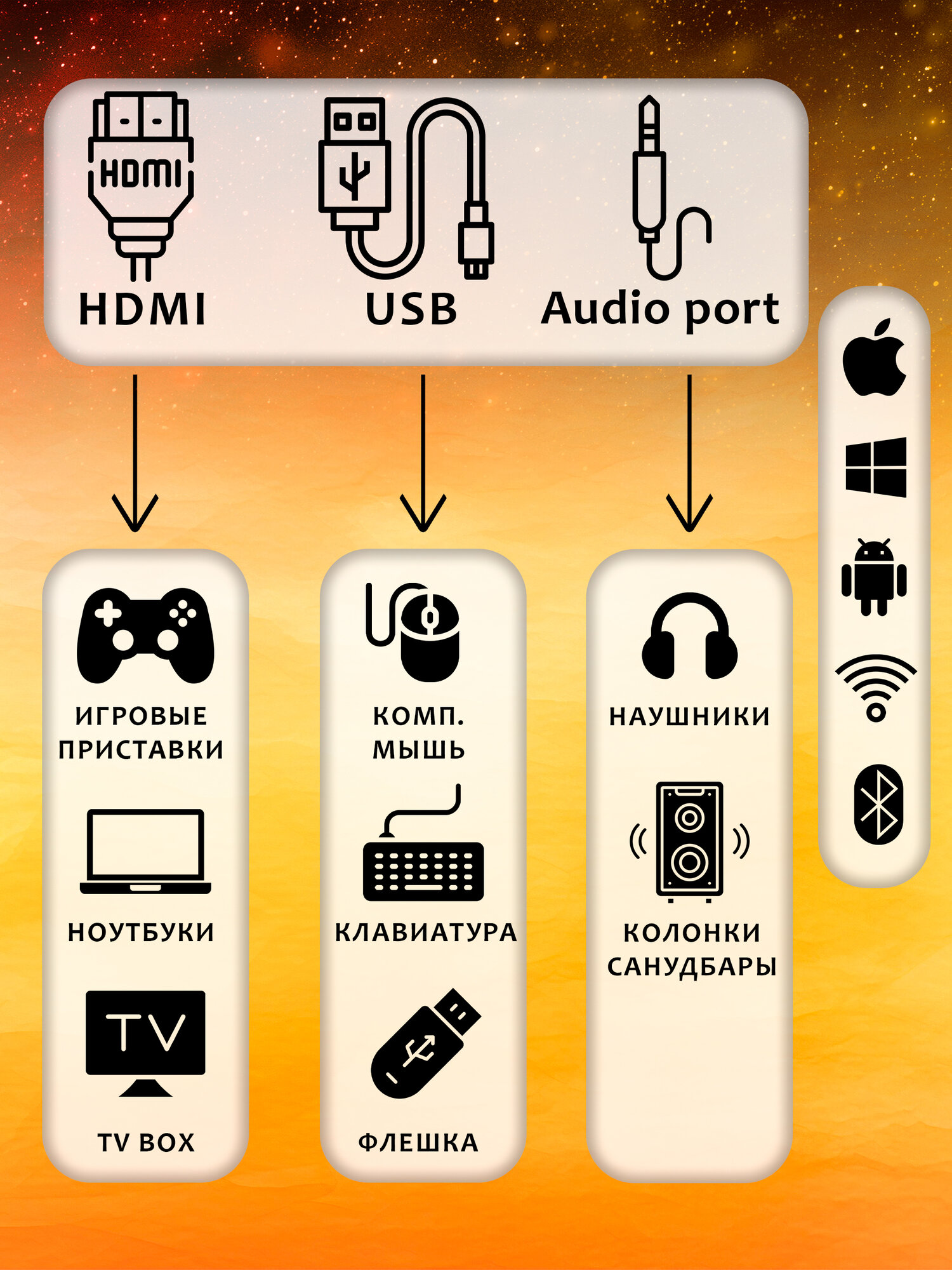 | Дополнительная информация | Комплектация: проектор, трипод, HDMI-кабель, кабель питания, кабель-переходник 3.5mm Jack- 3 RCA, 2 батарейки AAA, пульт, инструкция. |