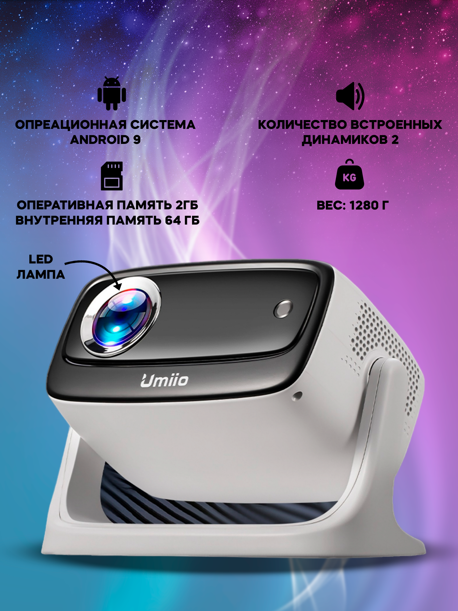 Проектор UMIIO Q1 HDMI для приставки и компьютера Wi-Fi 5G Bluetooth, с штативом, белый