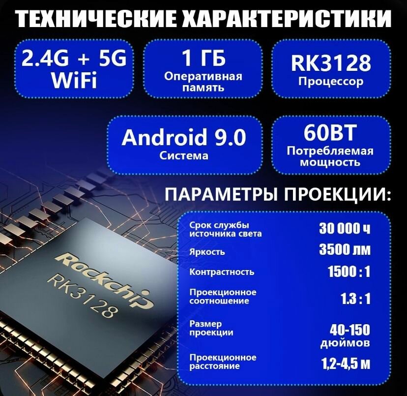 Проектор для фильмов / мини проектор, с Wi-Fi, Bluetooth, HDMI, встроенные динамики, 1LCD, пиковая яркость 3500 лм, макс. время работы лампы 50000 ч интересное: