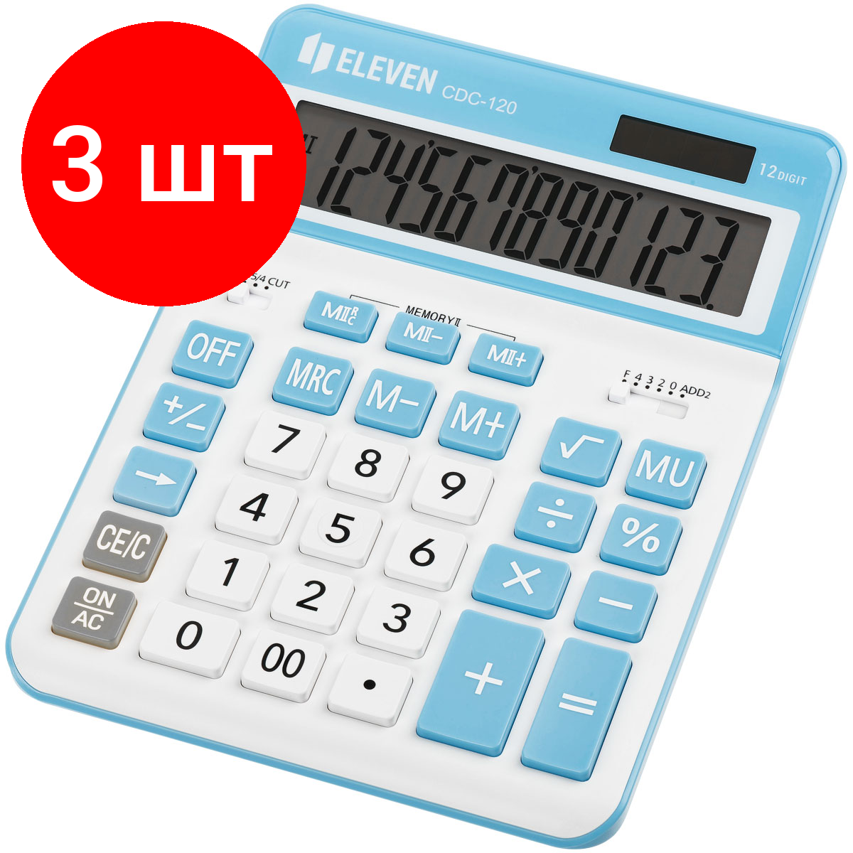 Комплект 3 шт, Калькулятор настольный Eleven CDC-120-WH/CY, 12 разрядов, двойное питание, 155*206*38мм, белый/синий интересное: