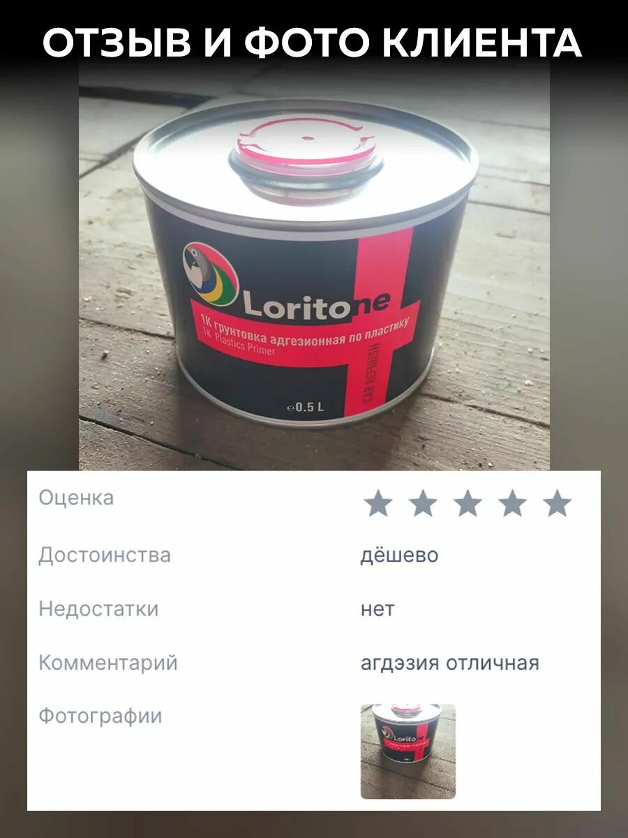 | Комплектация | Грунт адгезионный по пластику 1k PP Loritone прозрачный (без серебра), банка 0,5 л |