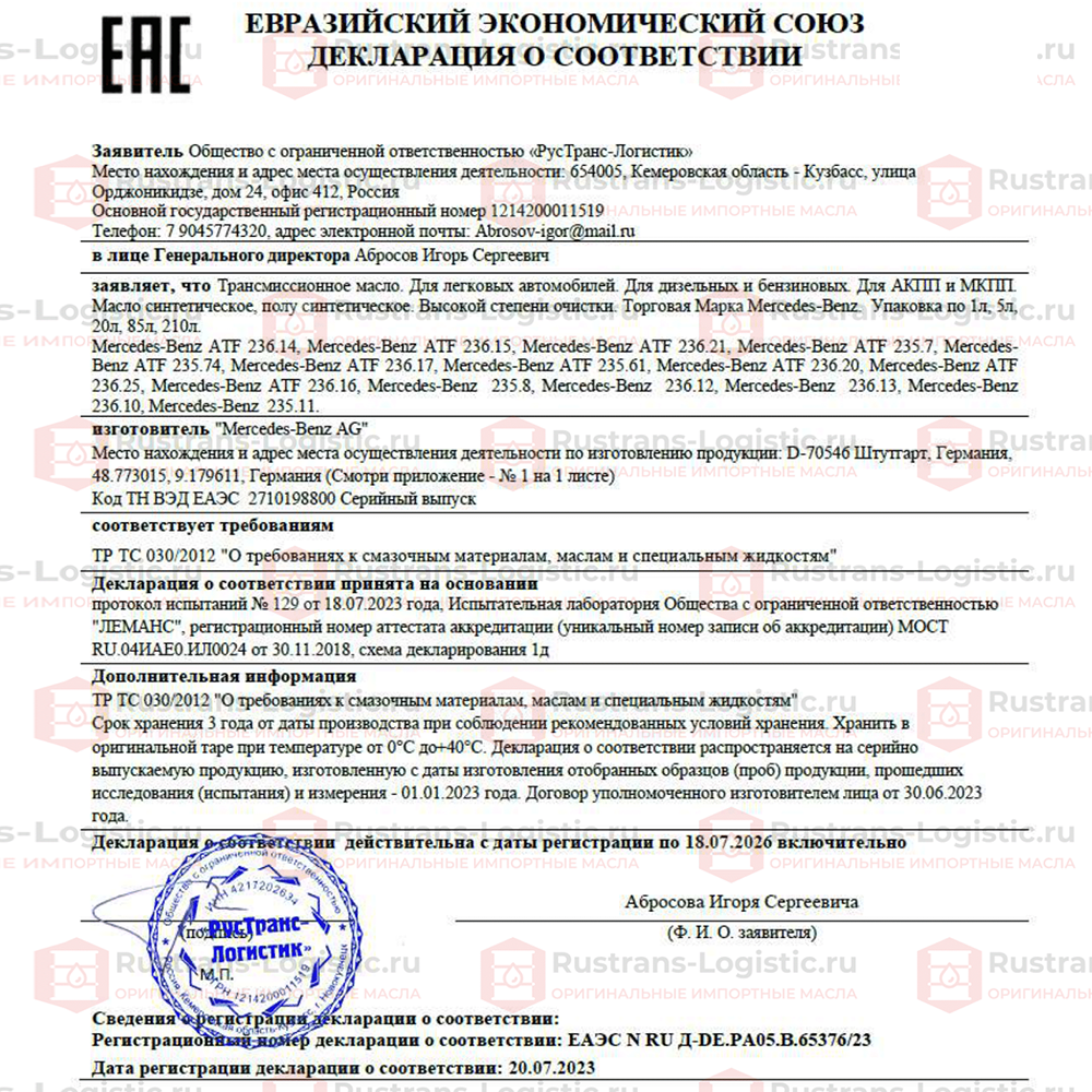 Масло трансмиссионное ATF МВ 236.15 Mercedes-Benz (Бельгия), (1л), жидкость для 7-и ступенчатая АКПП 722.9 и АКПП 724.2 Мерседес A000989690511AULW, РТЛ интересное: