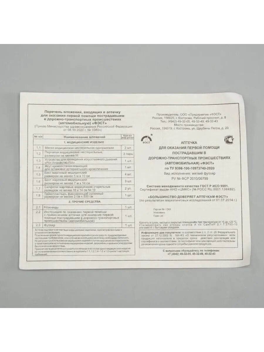 Аптечка автомобильная ФЭСТ футляр из полистирола, новый состав по приказу № 1080Н от 08.10.20