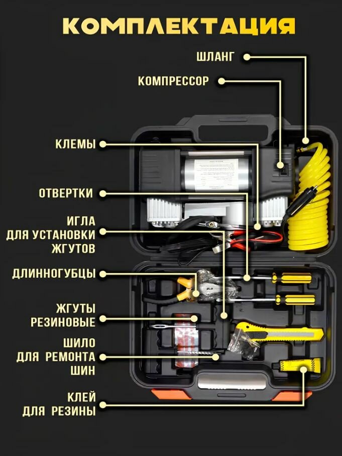 | Подробная комплектация | Компрессор (2-x цилиндровый) кейс, набор-ремкомплект-инструмент шнур 5м (крокодилы) |