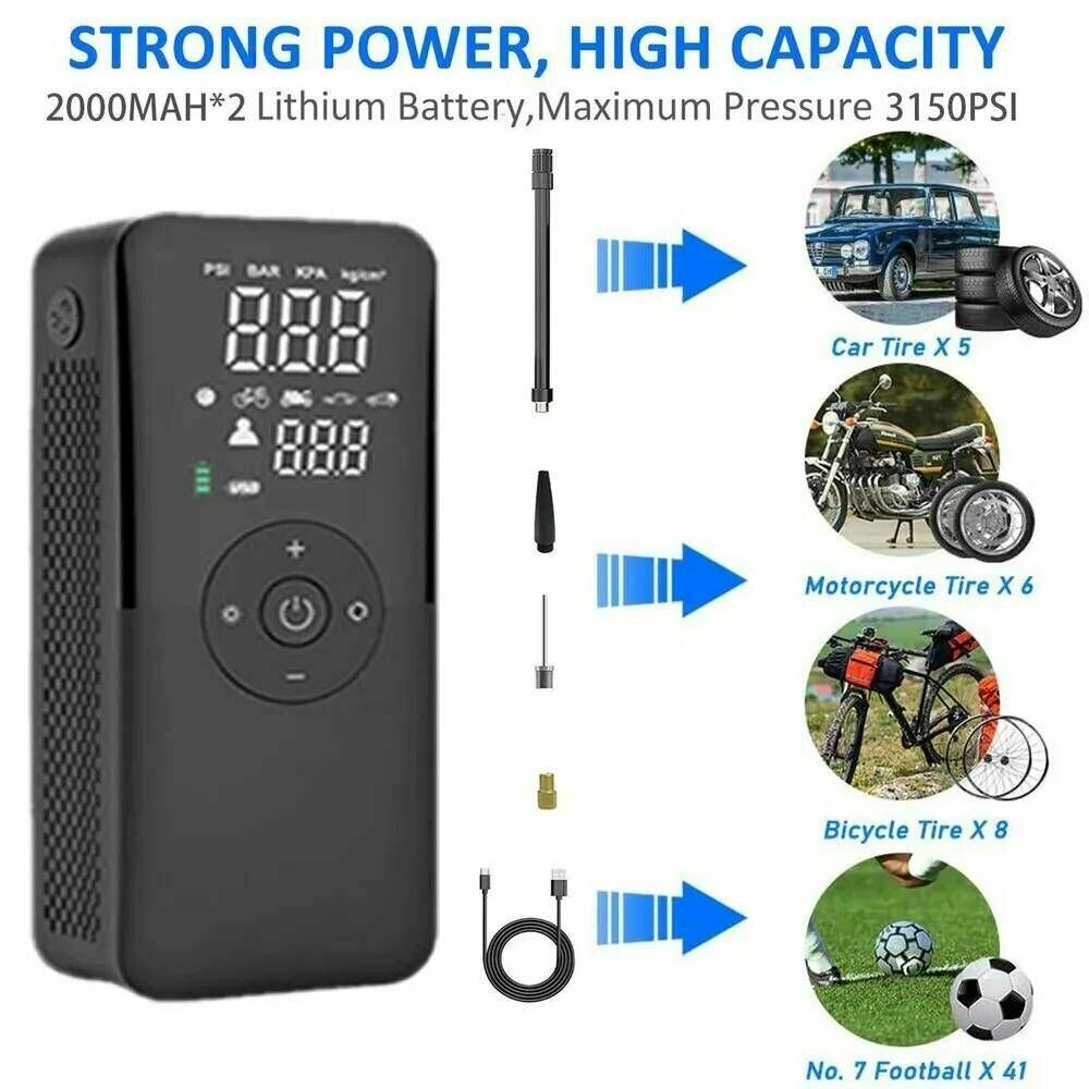 | Подробная комплектация | 1 x Насос 1 x Воздушная трубка, 3 x Насадки, 1 x Кабель для зарядки в прикуриватель 12В, 1 x Руководство пользователя |