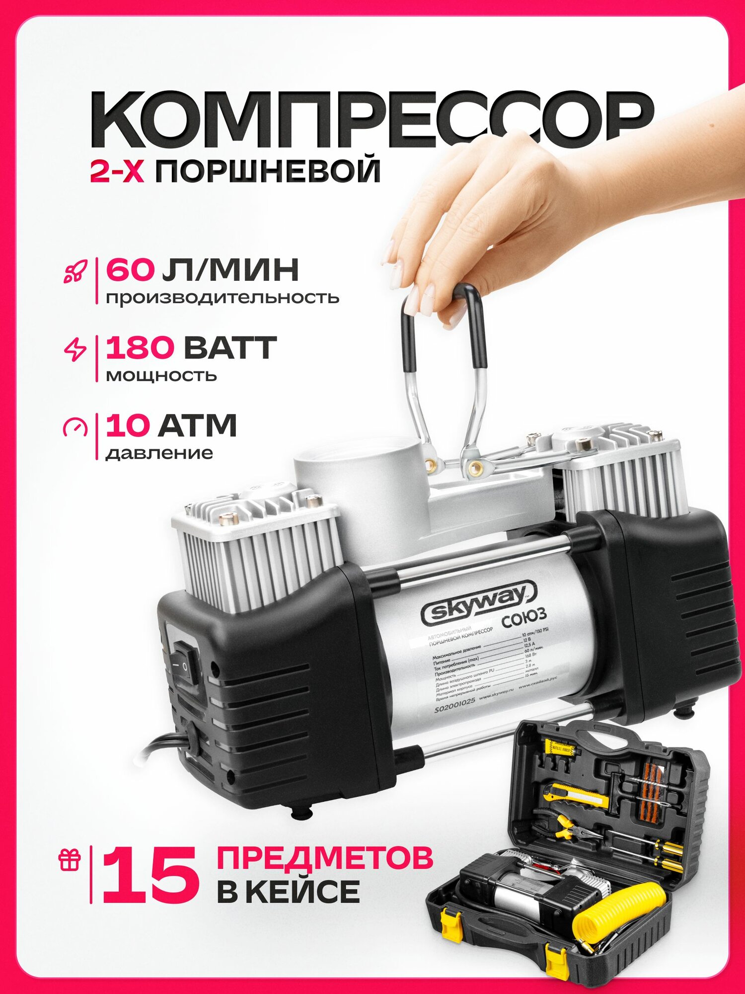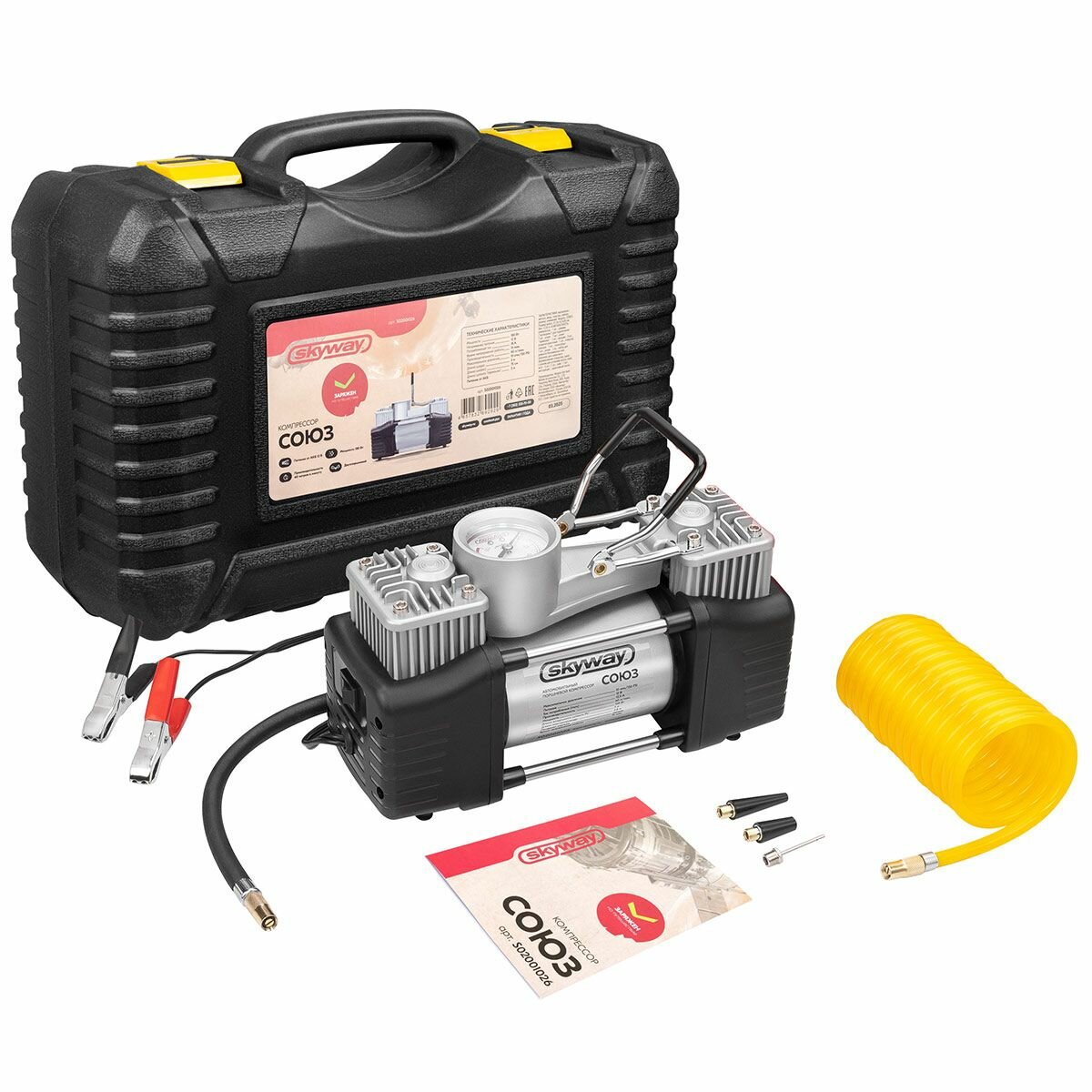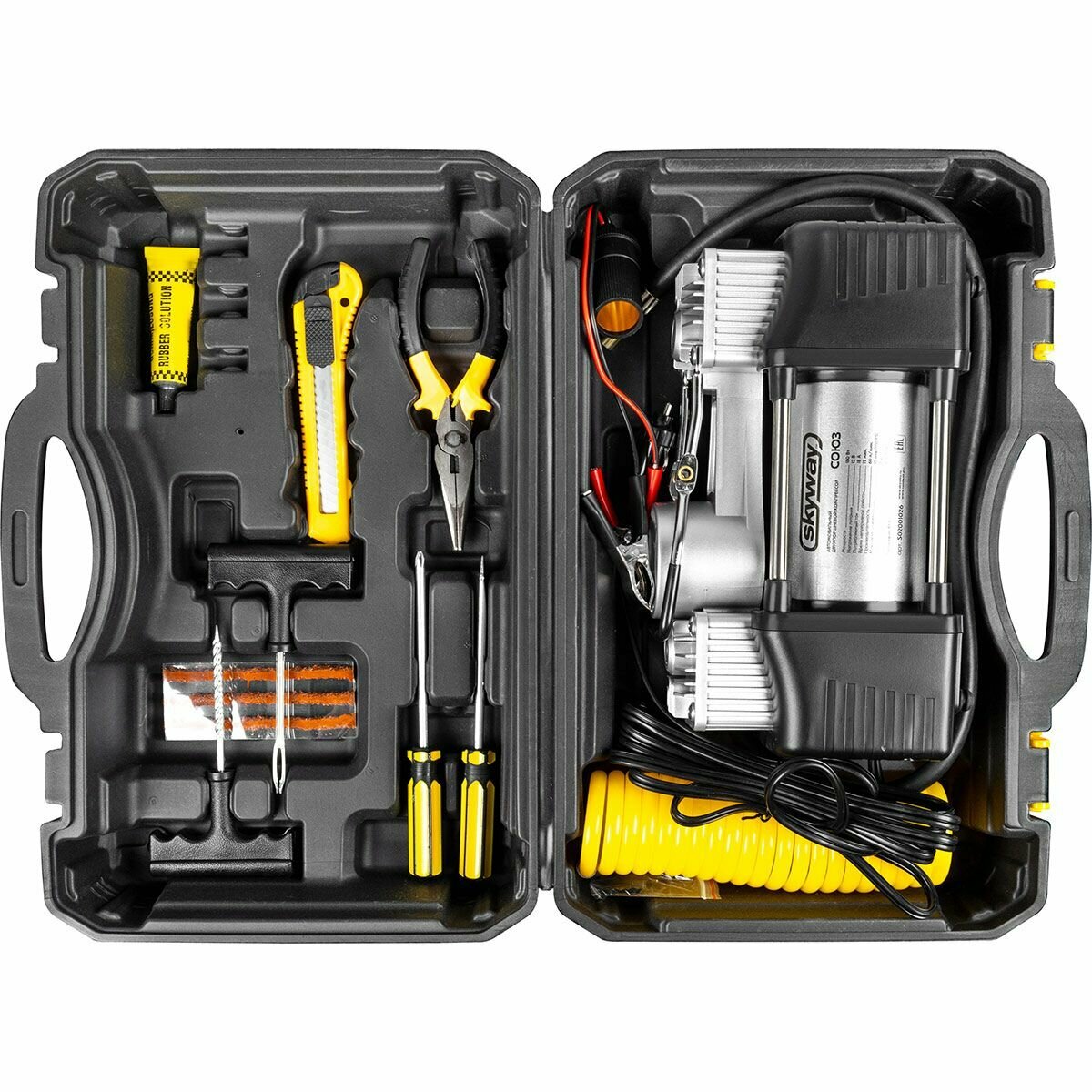 Компрессор автомобильный двухпоршневой "Союз" в кейсе с инструментами и набором для ремонта шин интересное: