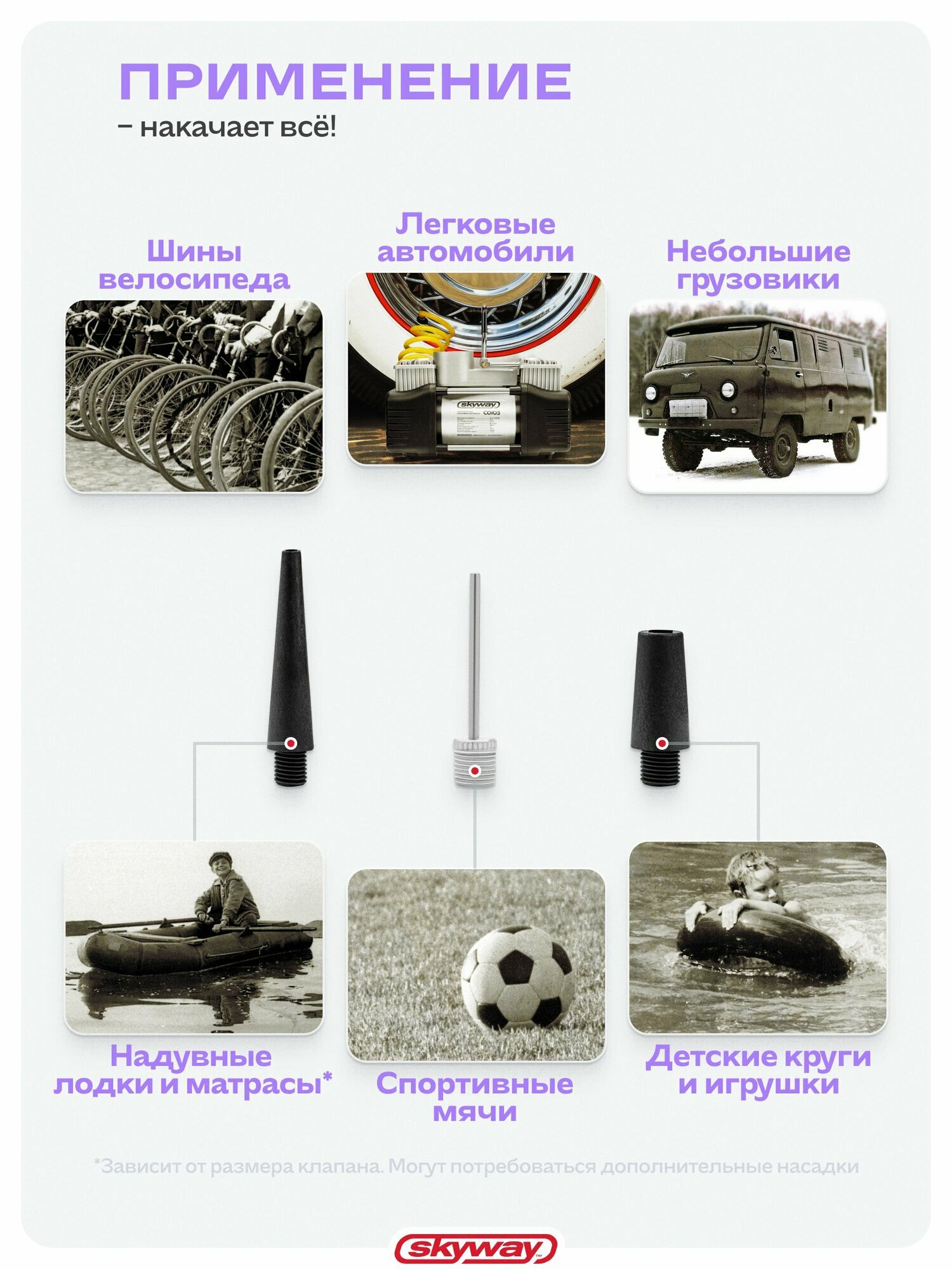 | Насадки | Для лодок, Для матрасов, Для мячей |