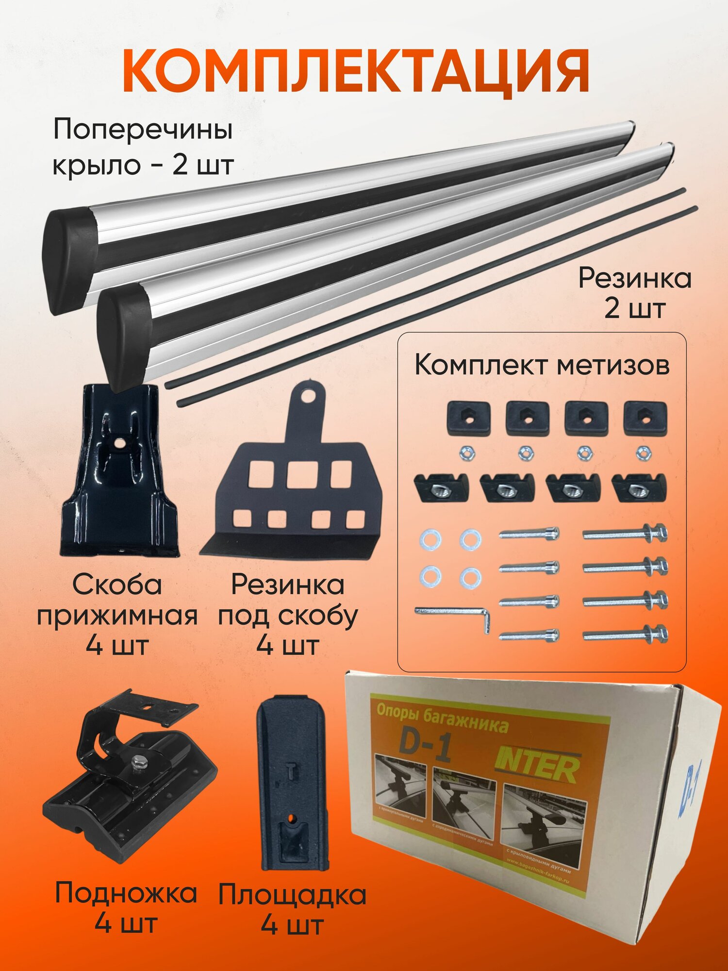 | Подробная комплектация | *4 опоры с адаптерами *2 металлические дуги в черном пластике, прямоугольного сечения, длинной 120 см *комплект крепежа *Инструкция |