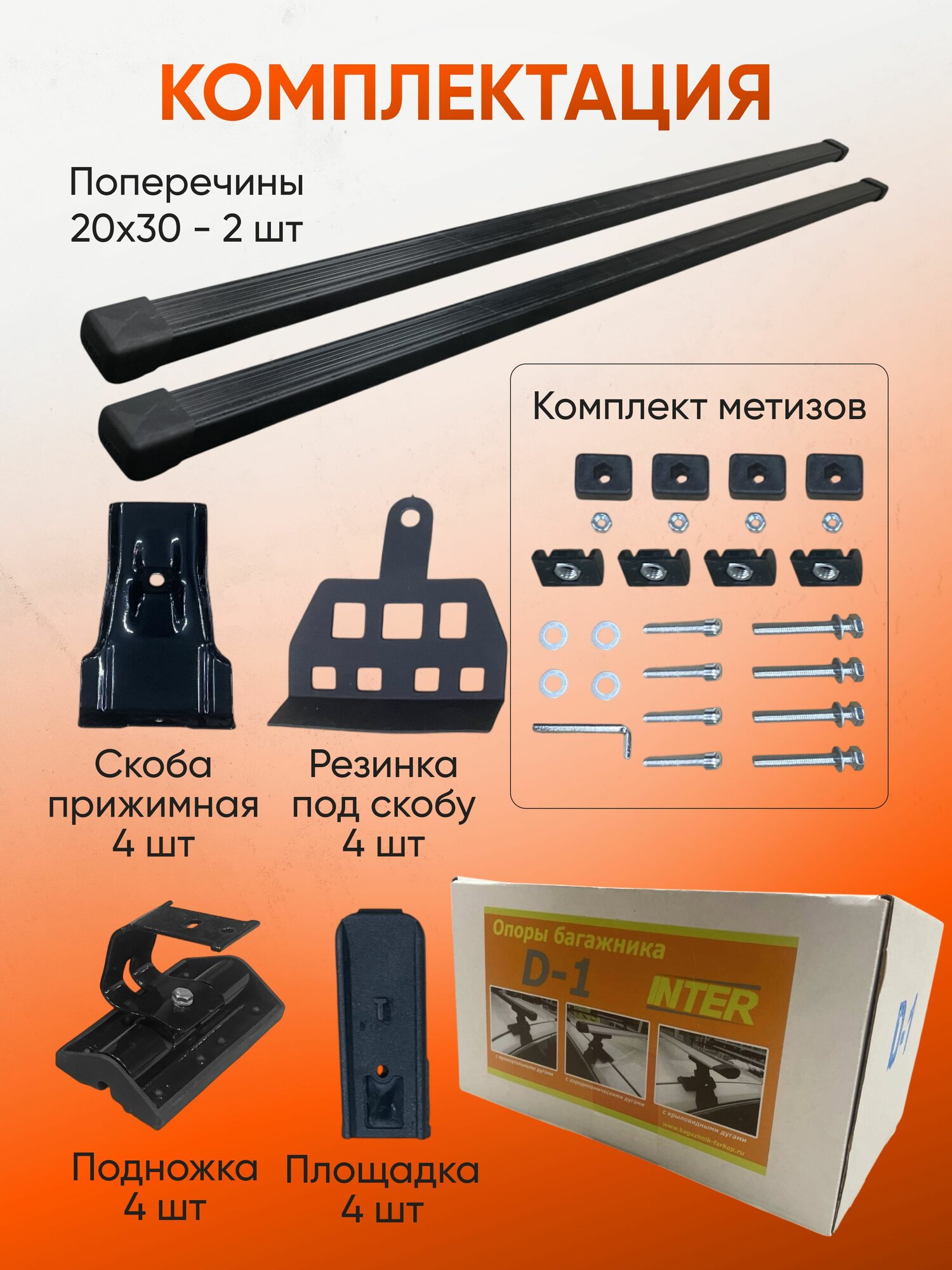 | Подробная комплектация | *4 опоры с адаптерами *2 металлические дуги в черном пластике, прямоугольного сечения, длинной 120 см *комплект крепежа *Инструкция |