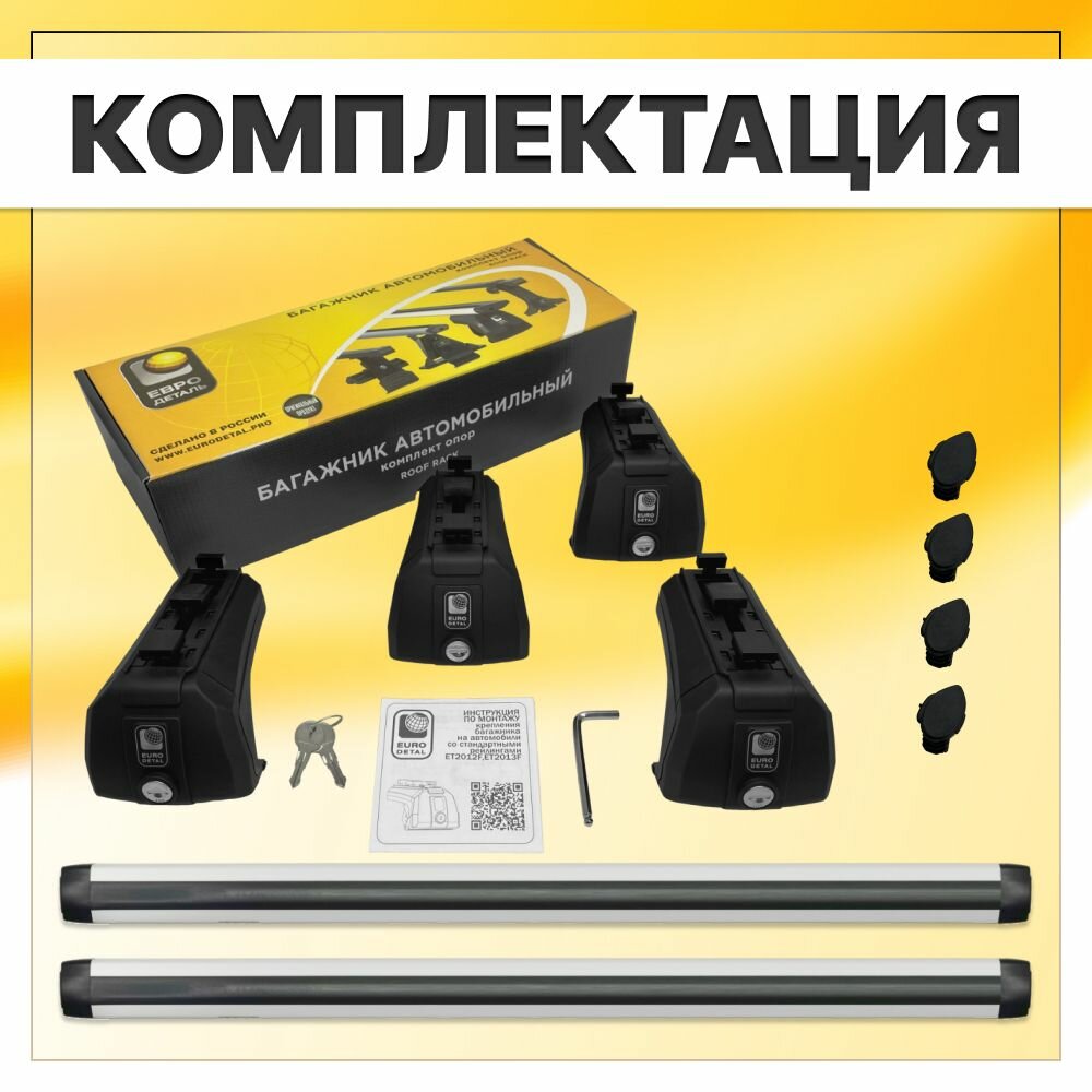 | Подробная комплектация | 4 опоры на рейлинги - 2 поперечины в зависимости от выбранного вариантв - инструкция - гарантийный талон. |