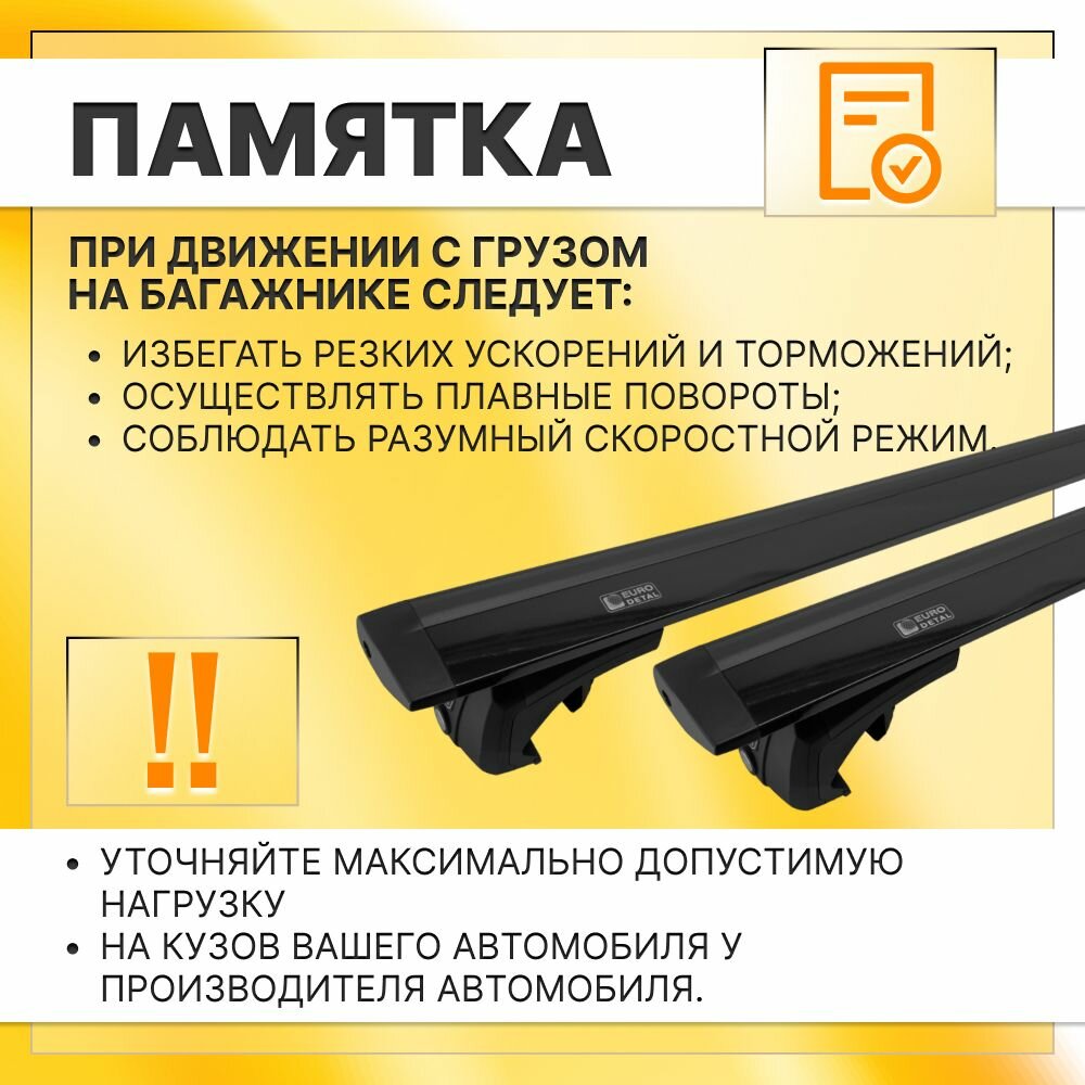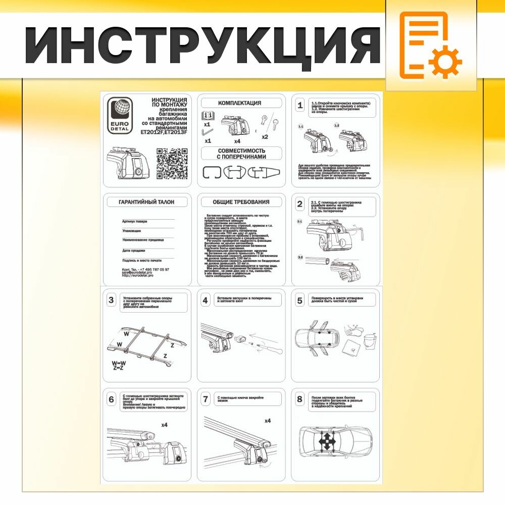 | Подробная комплектация | 4 опоры на рейлинги - 2 поперечины в зависимости от выбранного вариантв - инструкция - гарантийный талон. |