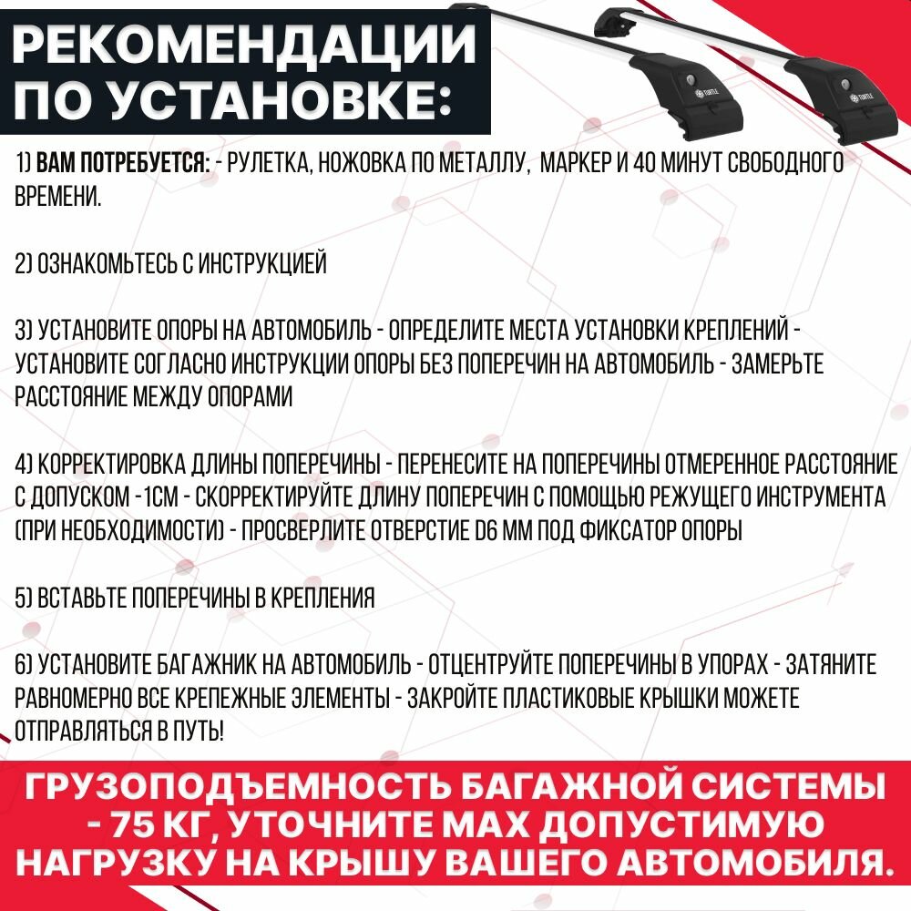 | Подробная комплектация | 2шт. крыловидных профиля, опоры 4шт. для стандартных рейлингов, замок 4 шт, ключ 2шт, инструмент для установки (шестигранник) 1шт., инструкция, коробка. |