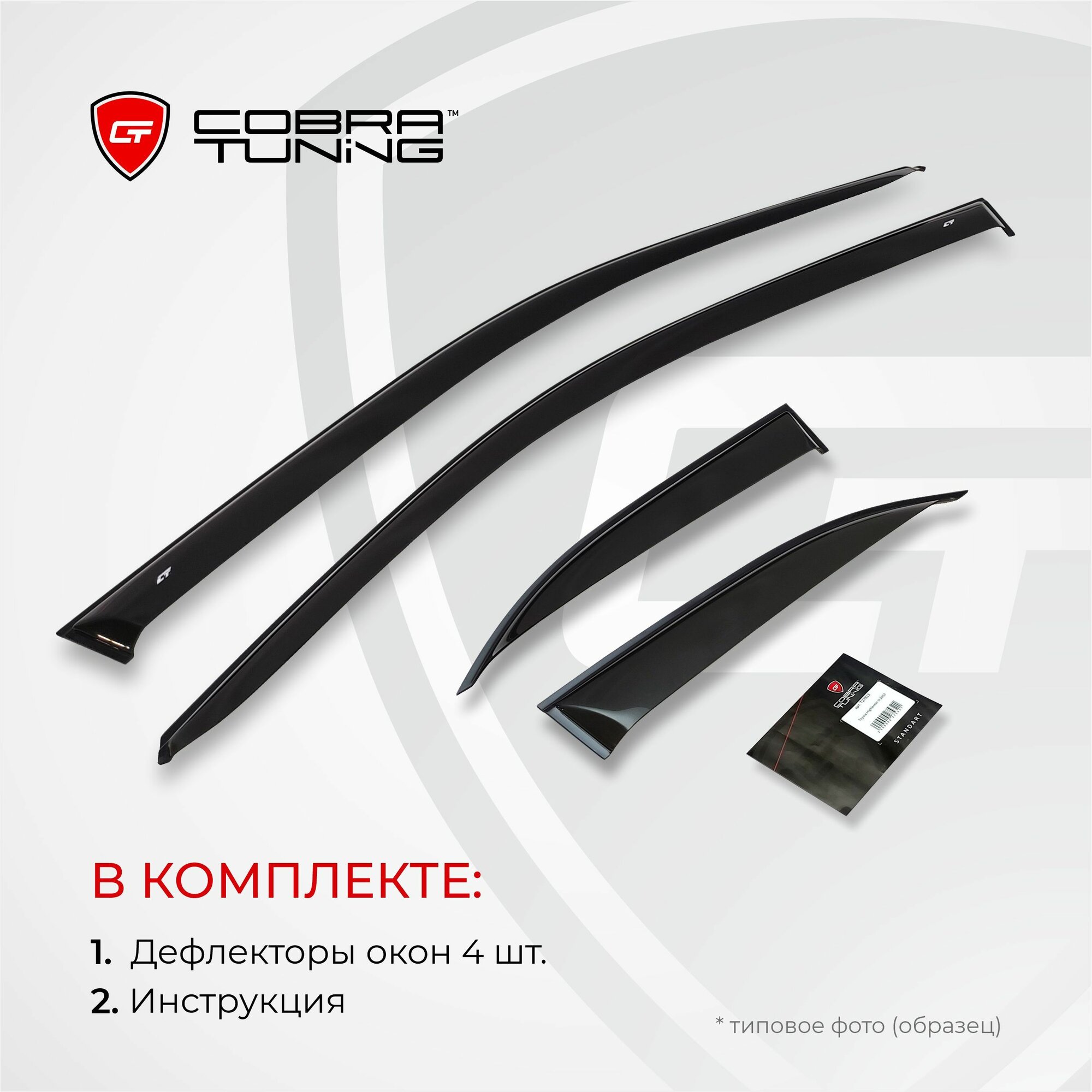 | Комплектация | Комплект дефлекторов окон на передние, задние двери автомобиля, и уголки (третья часть) - 4 шт. |