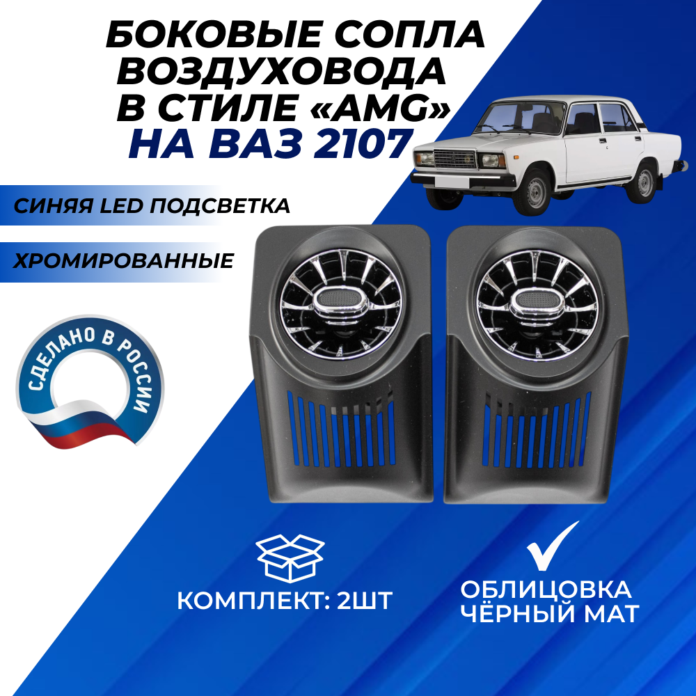 Купить Дефлекторы 2107 печки боковые синяя LED подсветка 2шт. в стиле АМГ, сопла воздуховода с регулировкой AMG для обогрева стекла на панель приборов хромированные с облицовкой черный мат