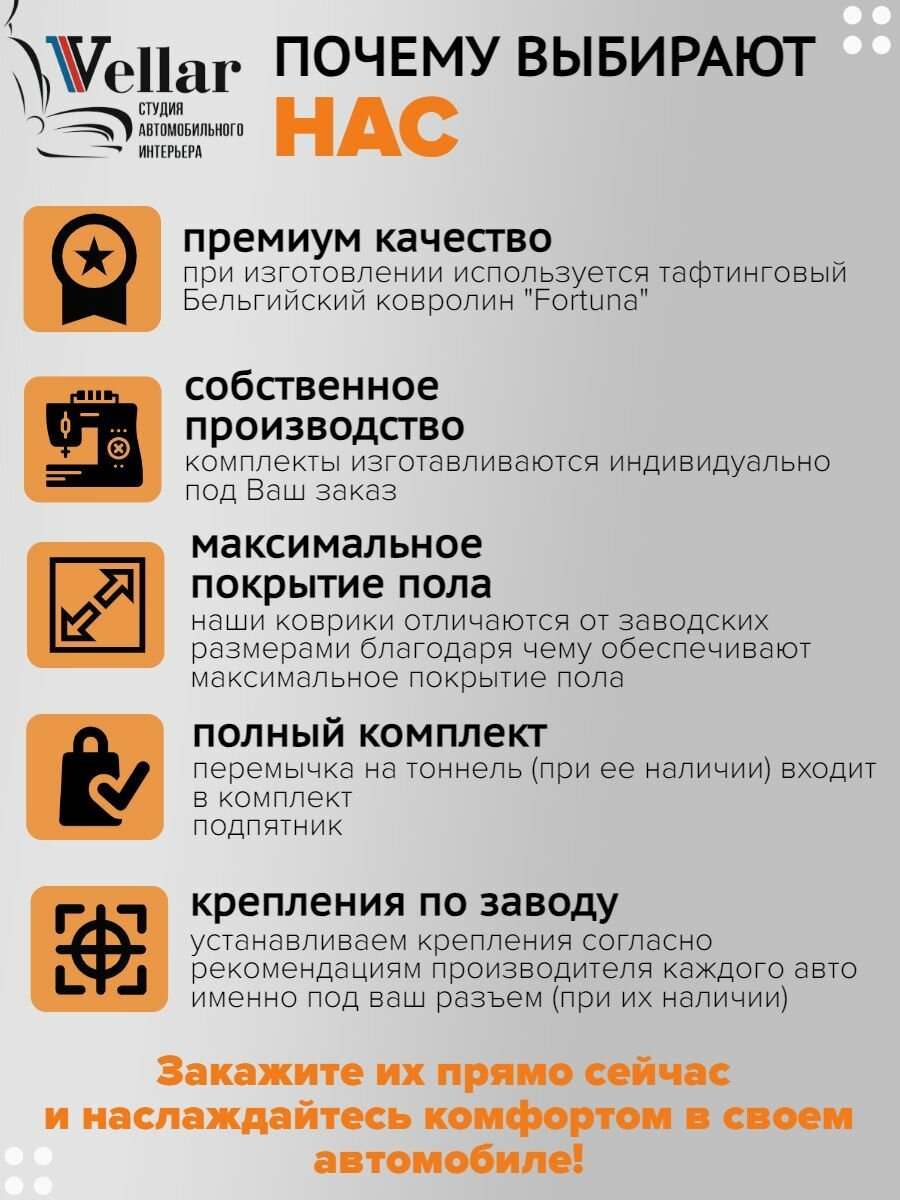 | Подробная комплектация | Водительский коврик - 1 шт Передний пассажирский коврик - 1 шт Задний правый пассажирский коврик - 1 шт Задний левый пассажирский коврик - 1 шт Перемычка на тоннель - 1 шт |