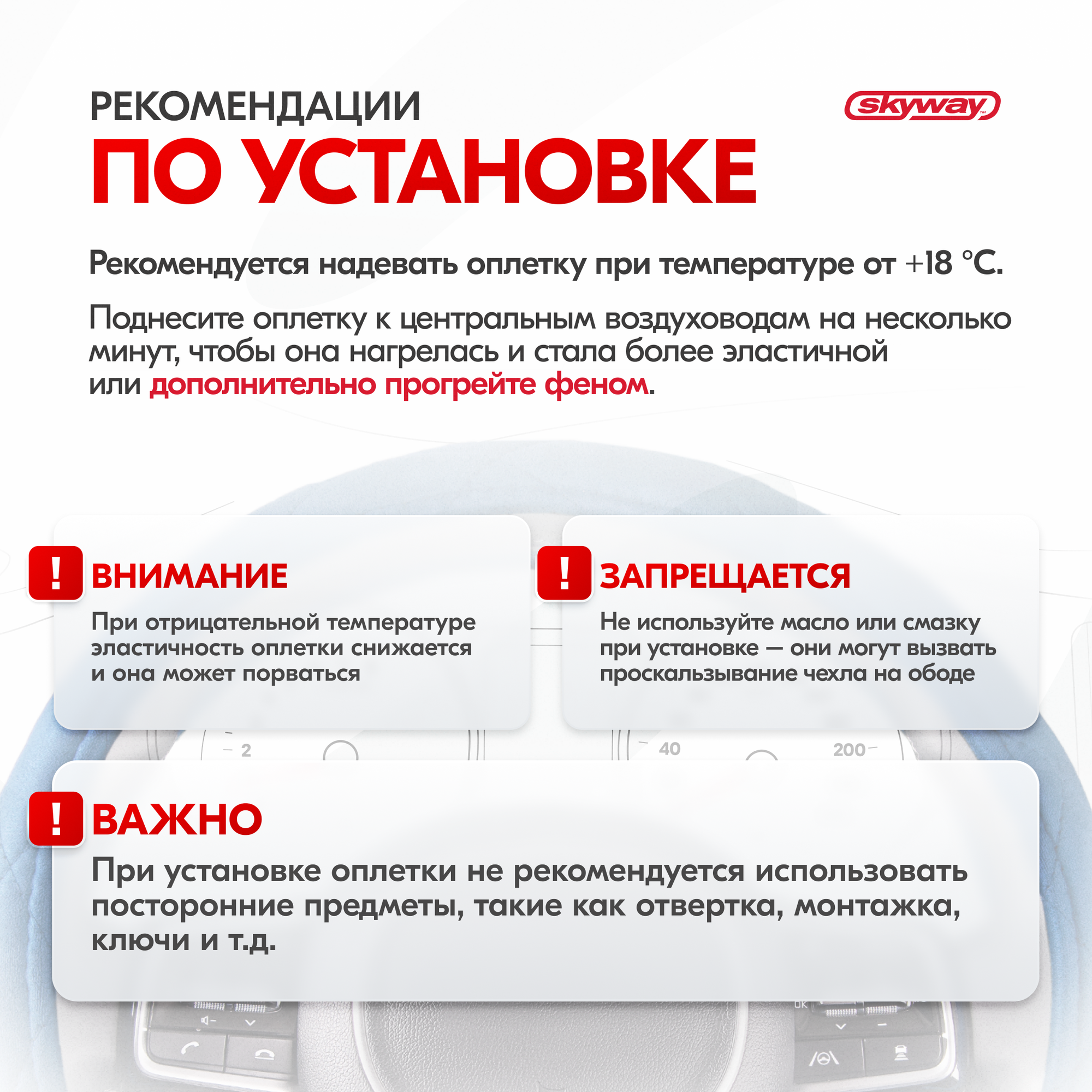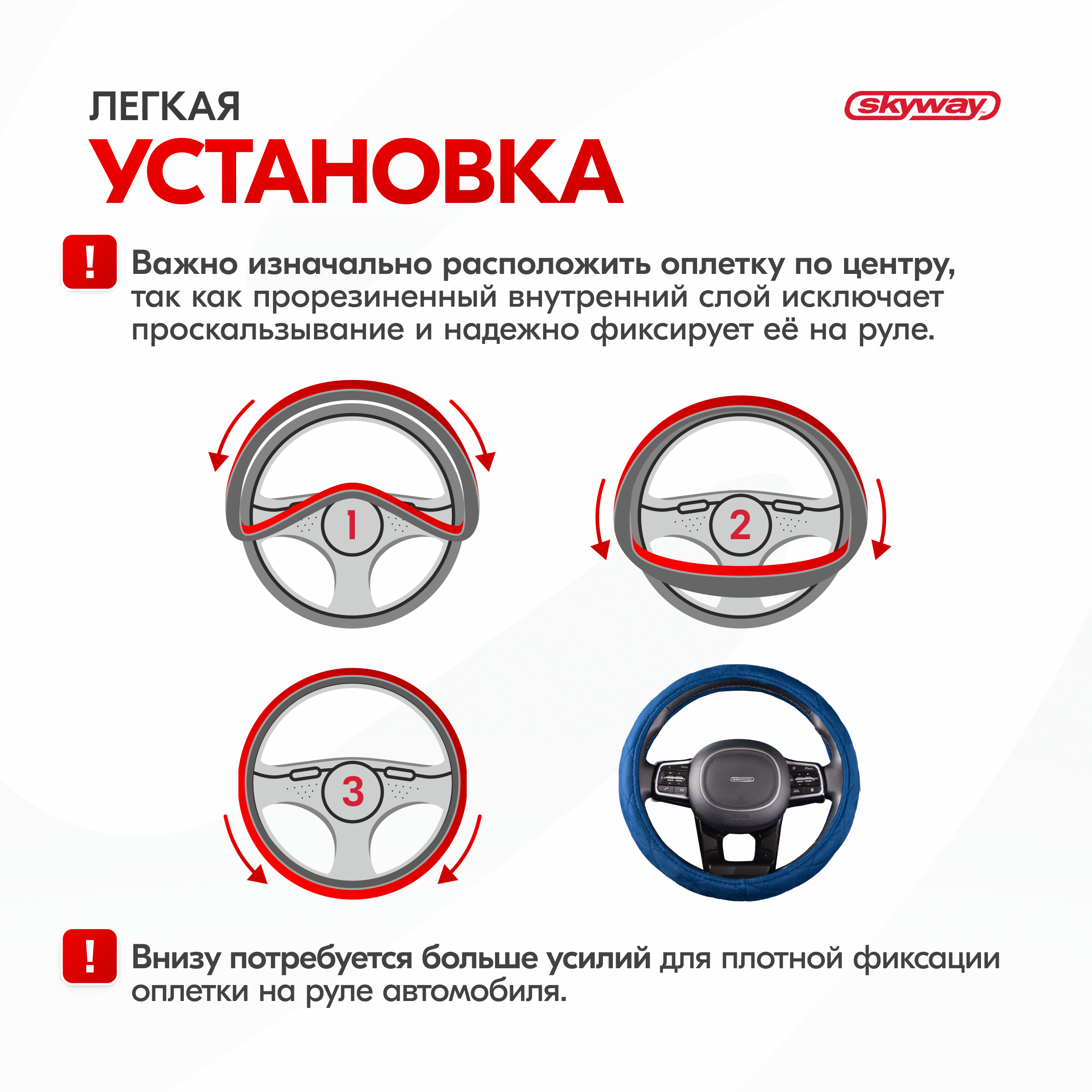 | Дополнительная информация | Рекомендации производителей: выбирайте оплётку под размер вашего рулевого колеса. Неверно выбранный размер может стать причиной проскальзывания оплётки, привести к невозможности снять или надеть её на руль. |