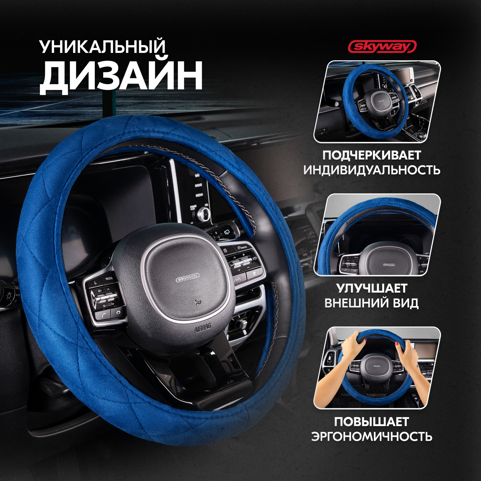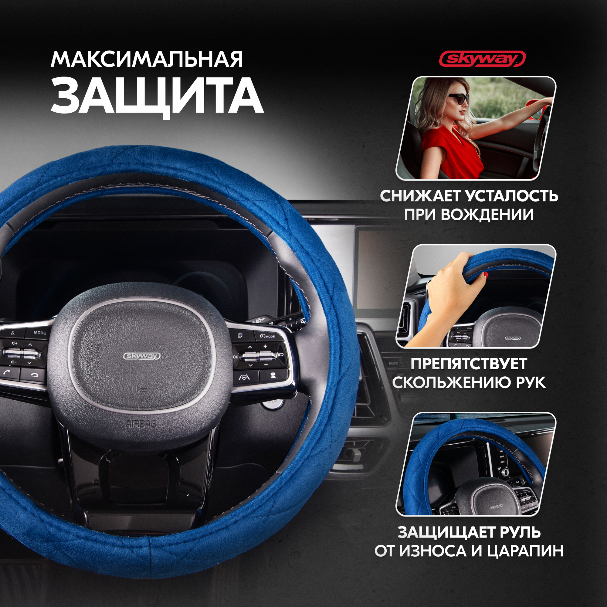 Купить Оплетка руля SKYWAY Hit-1, размер M, диаметр руля 37/38/39см, синий алькантара, S01101053