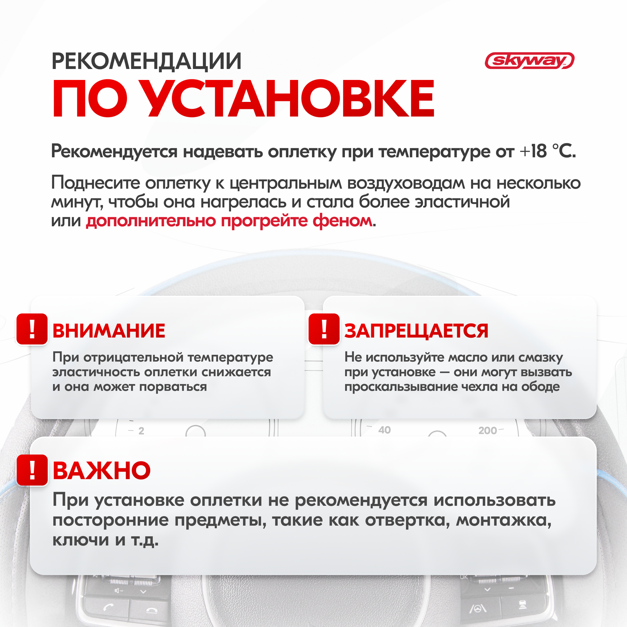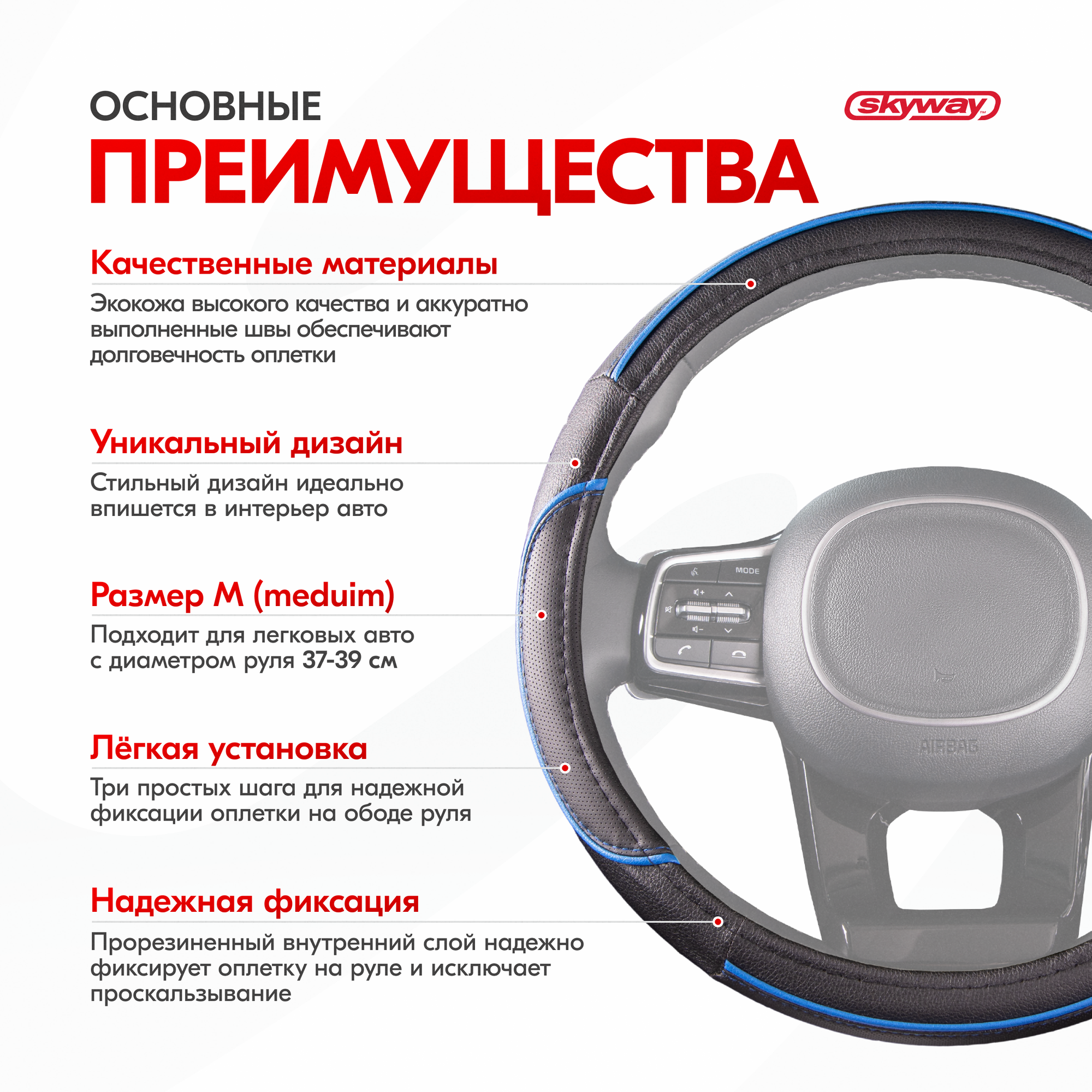 | Дополнительная информация | Рекомендации производителей: выбирайте оплётку под размер вашего рулевого колеса. Неверно выбранный размер может стать причиной проскальзывания оплётки, привести к невозможности снять или надеть её на руль. |