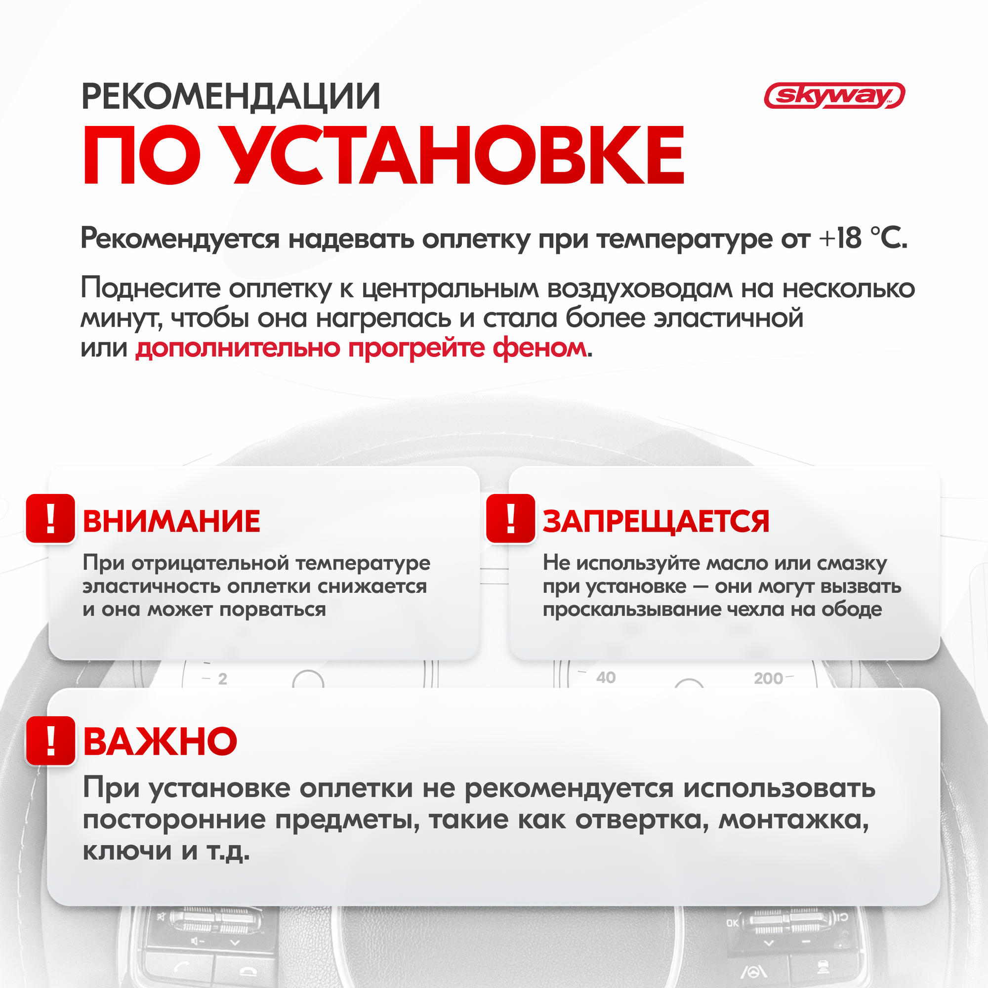 | Дополнительная информация | Рекомендации производителей: выбирайте оплётку под размер вашего рулевого колеса. Неверно выбранный размер может стать причиной проскальзывания оплётки, привести к невозможности снять или надеть её на руль. |