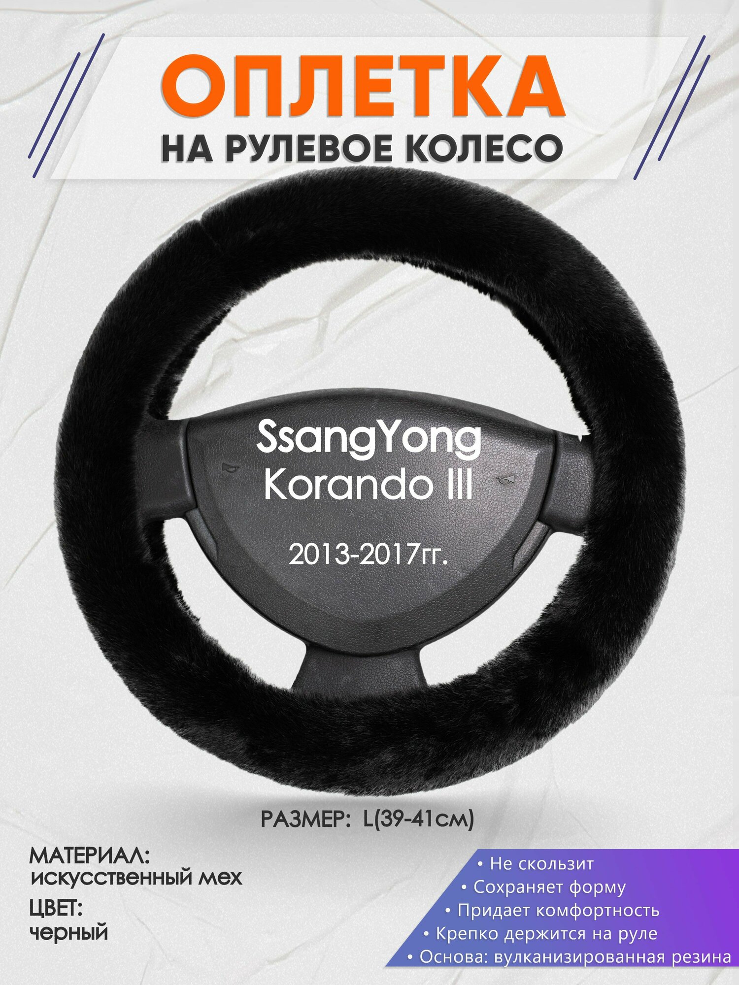 Оплетка на руль для SsangYong Korando 3(Санг Енг корандо) 2013-2017, L(39-41см), Искусственный мех 41