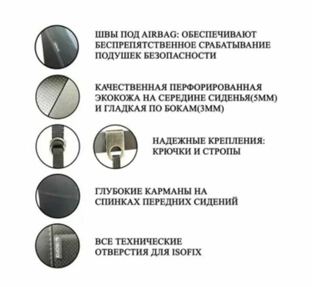 | Особенности | износоустойчивая ткань / Использование с боковыми airbag / Карманы в спинках передних сидений / Крепеж / Петли для крепления / Стягивающая резинка по периметру / Фиксирующие резинки |