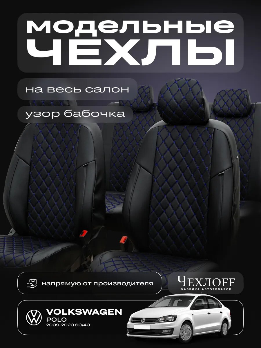 Чехлы ЧехлоFF для Volkswagen Polo, экокожа, чёрно-синий, передние/задние, комплект интересное: