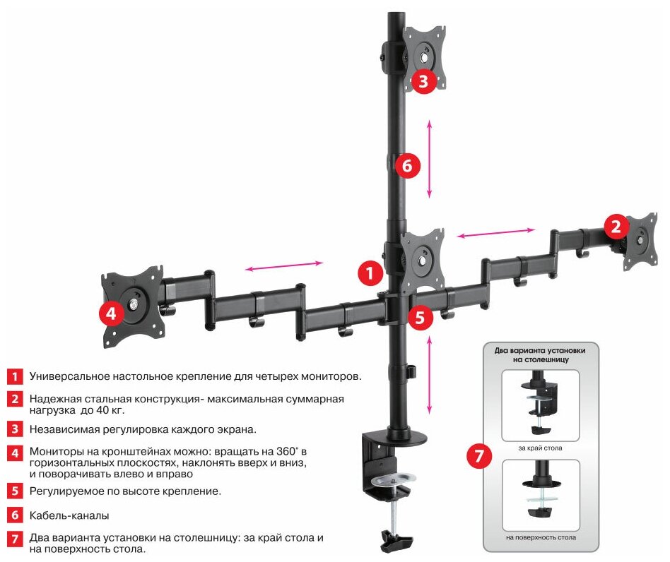 | Плюсы: | Можно закрепить до 4-м мониторов.