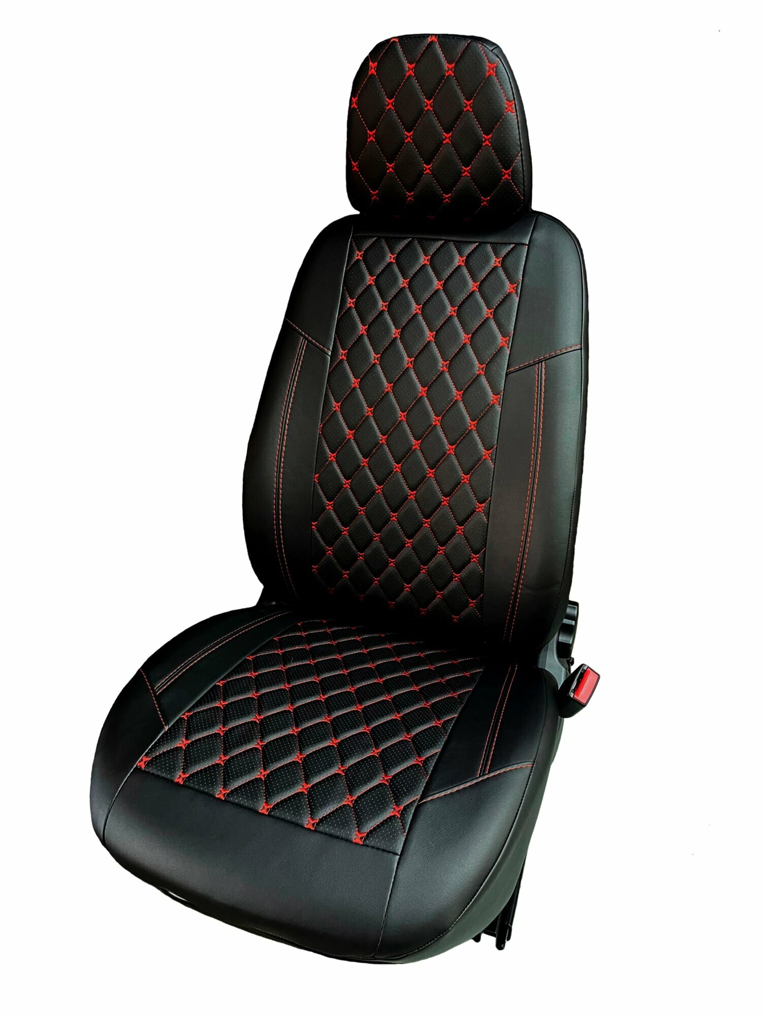 Комплект чехлов для Ford Focus III Ambiente/Trend Sd/Hb/Wag с 11г. (без заднего подлокотника) Экокожа, ромб, черный, красная строчка.