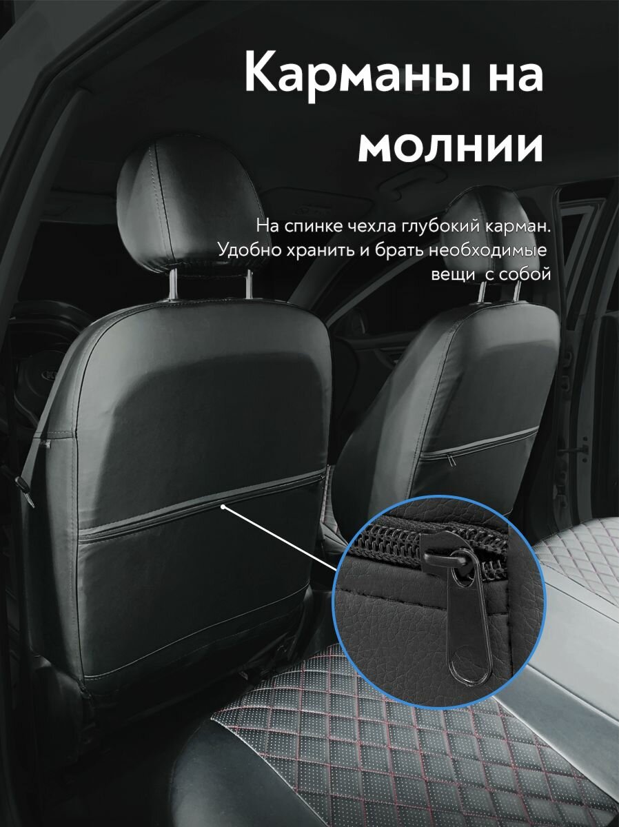 Чехлы на сидения для Мазда 3 (Mazda III) с 2004 - 2010 г. в. (спинка заднего сидения 40/60, раздельная) из экокожи, ромб, черные с красной строчкой интересное: