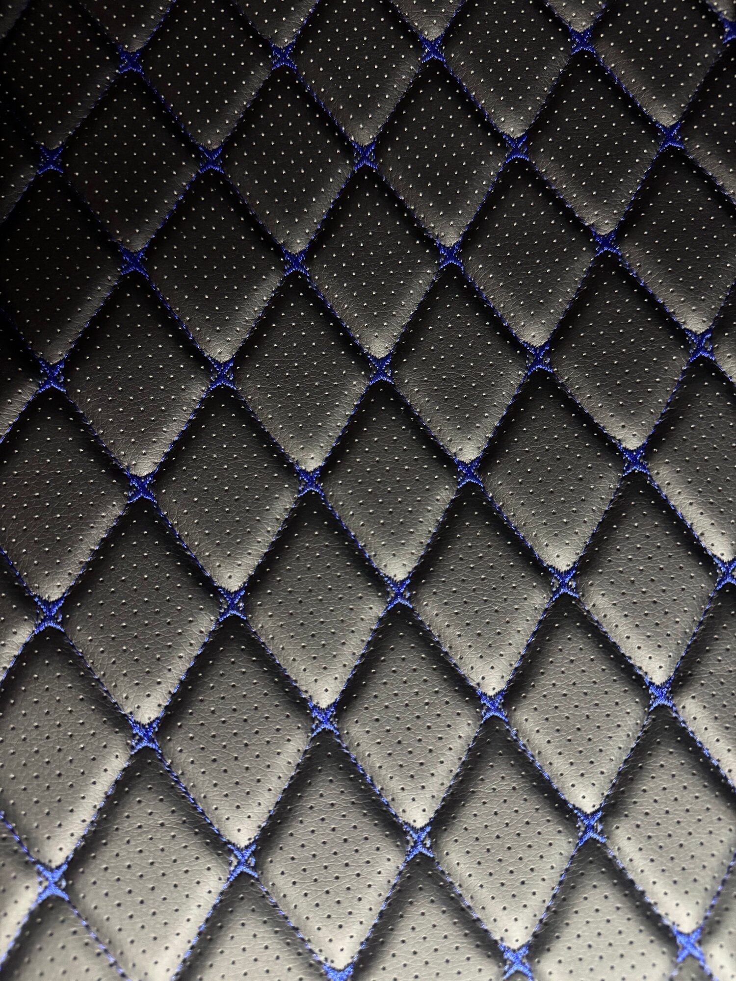 Купить Комплект чехлов для Renault Logan II 40/60 / Sandero II (без подушек безопасности) c 14г. Экокожа, ромб, черный, синяя строчка бабочка.